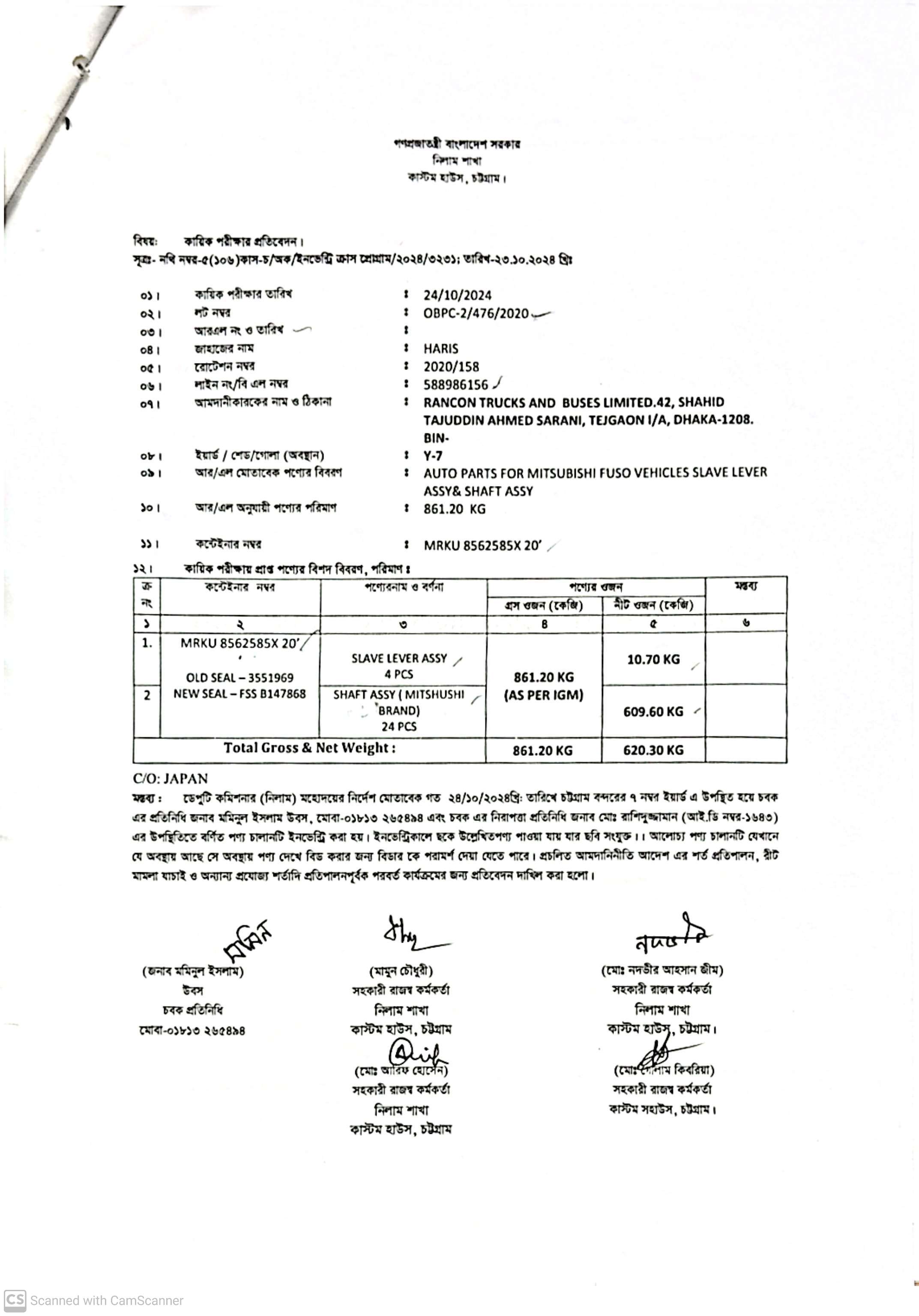 (1) Slave Leaver Assy-4 Pcs= 10.70 Kg; (2) Shaft Assy (Mitsuhashi Brand)-24 Pcs= 609.60 Kg |