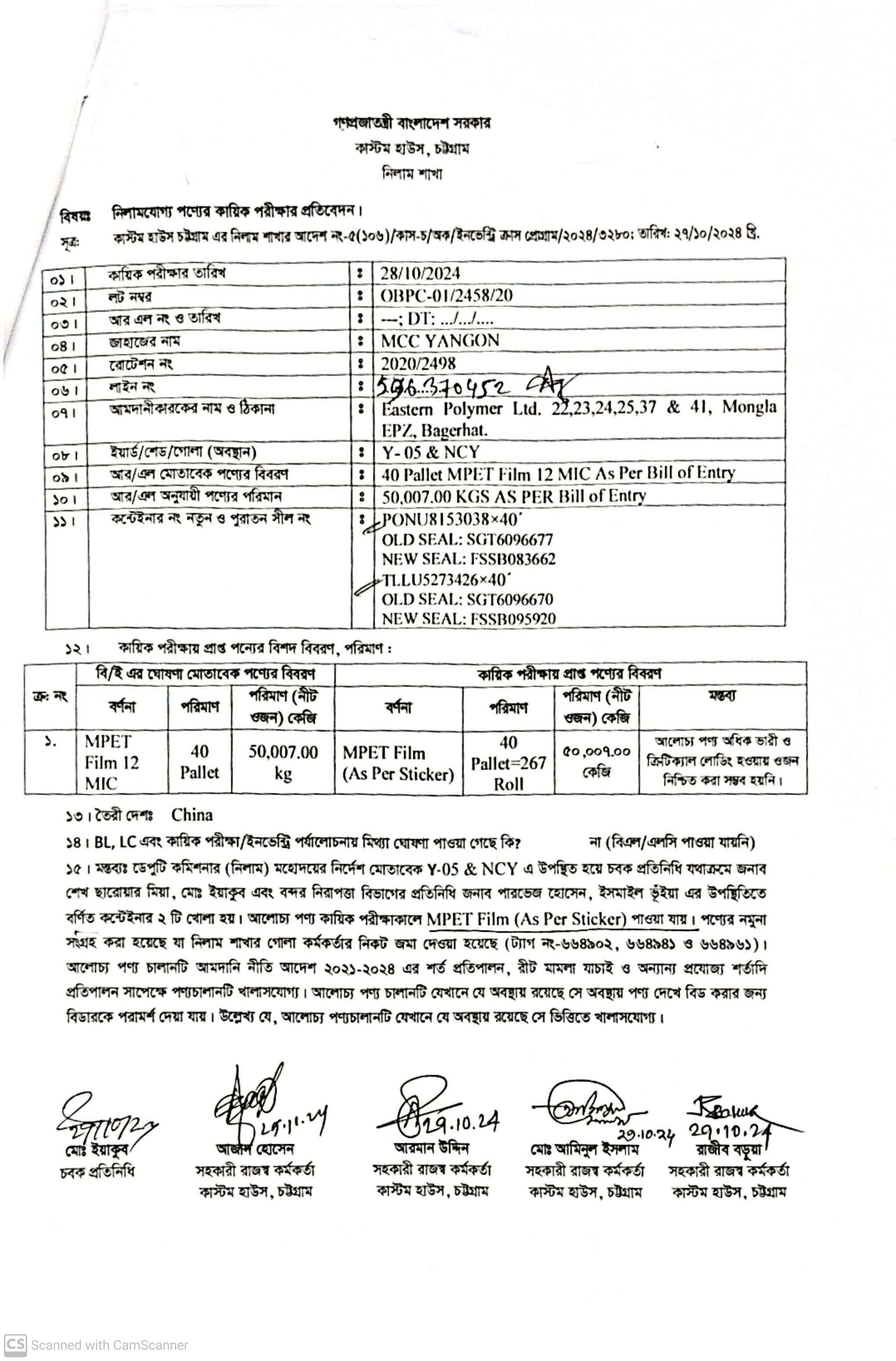 Terms & condition : নিলাম বিজ্ঞপ্তিতে উল্লিখিত সময়ের মধ্যে সেখানে সে অবস্থায় আছে, সে অবস্থায় সরেজমিন পণ্য পরিদর্শন করে নিলামে অংশগ্রহণ করার জন্য আগ্রহী নিলাম ক্রেতাগণকে অনুরোধ করা যাচ্ছে। দরপত্র উন্মুক্ত করার পর নিলামে অংশগ্রহণকারী/বিডার কর্তৃক পণ্য সংক্রান্ত কোন আপত্তি/আবেদন গ্রহণযোগ্য হবে না। আমদানি নীতি আদেশ ২০২১-২০২৪, বিদ্যমান অন্যান্য আইন ও বিধি-বিধানের প্রযোজ্য সকল শর্ত যথাযথ পরিপালনপূর্বক, প্রযোজ্য ক্ষেত্রে রাসায়নিক পরীক্ষার মাধ্যমে নিলামে বিক্রয়যোগ্য পণ্যের সঠিকতা যাচাই ও ব্যবহার উপযোগিতা থাকা সাপেক্ষে এবং খালাসকালে পণ্যের বর্ণনা এবং ওজন নিশ্চিত করে পণ্য ছাড়যোগ্য হবে। কোনরূপ কারণ দর্শানো ব্যতিরেকে কর্তৃপক্ষ যে কোন সময় ও পর্যায়ে যে কোন লট বা সকল লটের নিলাম আংশিক বা সম্পূর্ণ স্থগিত বা বাতিল করার অধিকার সংরক্ষণ করেন।