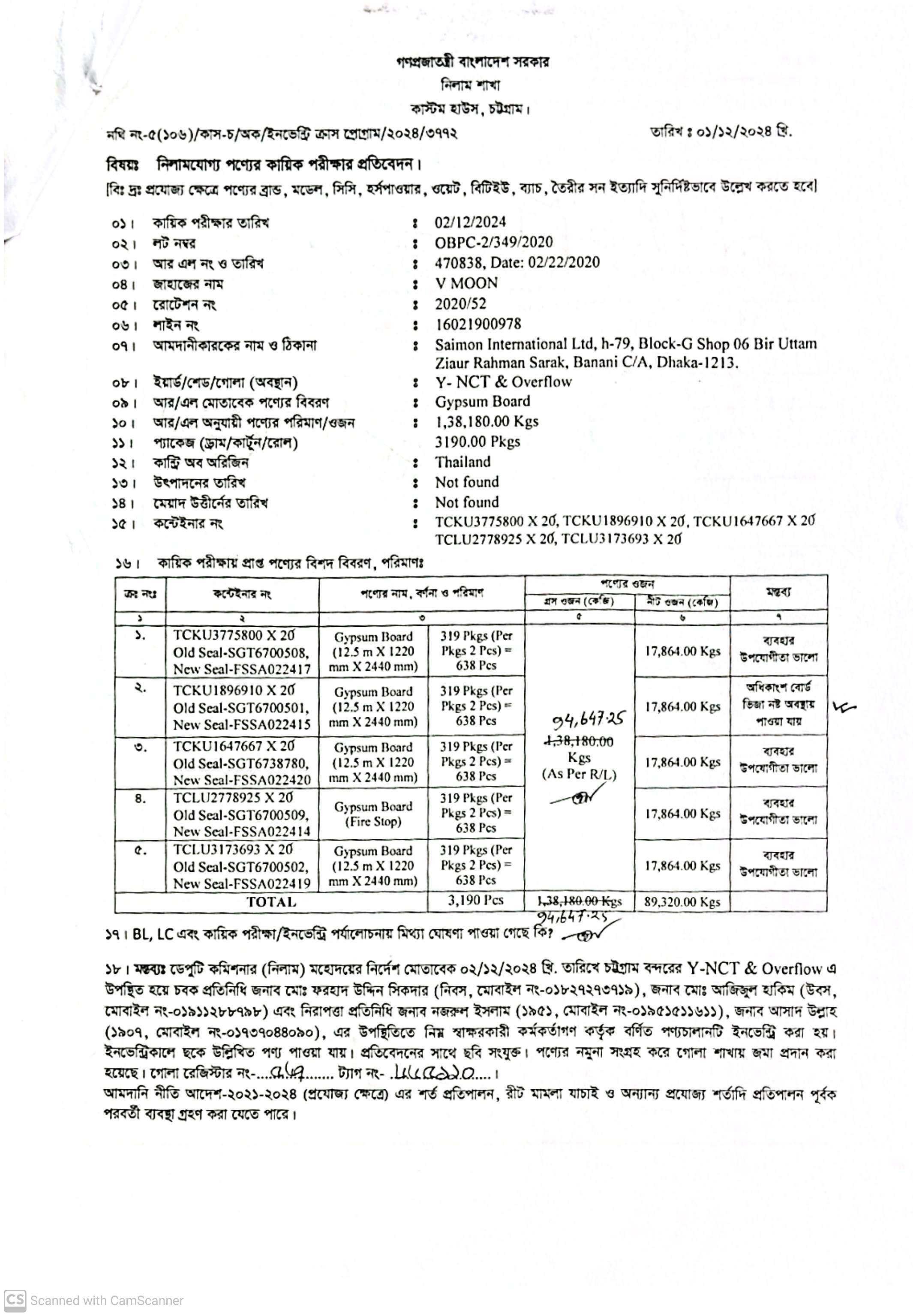 (1) Gypsum Board (12.50 m X 1220 mm X 2440 mm): 2552 Pcs= 71,456 Kg; (2) Gypsum Board (Fire Stop): 638 Pcs= 17,864 Kg. C/O: Thailand |