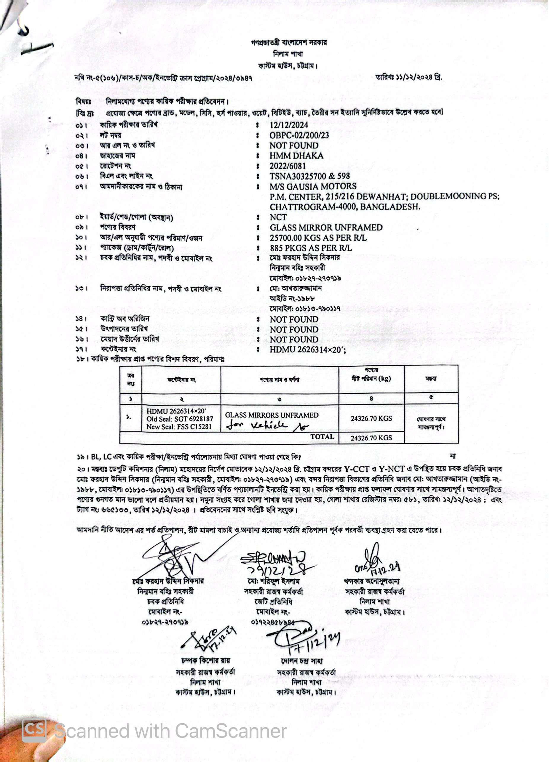 Terms & condition : নিলাম বিজ্ঞপ্তিতে উল্লিখিত সময়ের মধ্যে সেখানে সে অবস্থায় আছে, সে অবস্থায় সরেজমিন পণ্য পরিদর্শন করে নিলামে অংশগ্রহণ করার জন্য আগ্রহী নিলাম ক্রেতাগণকে অনুরোধ করা যাচ্ছে। দরপত্র উন্মুক্ত করার পর নিলামে অংশগ্রহণকারী/বিডার কর্তৃক পণ্য সংক্রান্ত কোন আপত্তি/আবেদন গ্রহণযোগ্য হবে না। আমদানি নীতি আদেশ ২০২১-২০২৪, বিদ্যমান অন্যান্য আইন ও বিধি-বিধানের প্রযোজ্য সকল শর্ত যথাযথ পরিপালনপূর্বক, প্রযোজ্য ক্ষেত্রে রাসায়নিক পরীক্ষার মাধ্যমে নিলামে বিক্রয়যোগ্য পণ্যের সঠিকতা যাচাই ও ব্যবহার উপযোগিতা থাকা সাপেক্ষে এবং খালাসকালে পণ্যের বর্ণনা এবং ওজন নিশ্চিত করে পণ্য ছাড়যোগ্য হবে। কোনরূপ কারণ দর্শানো ব্যতিরেকে কর্তৃপক্ষ যে কোন সময় ও পর্যায়ে যে কোন লট বা সকল লটের নিলাম আংশিক বা সম্পূর্ণ স্থগিত বা বাতিল করার অধিকার সংরক্ষণ করেন।