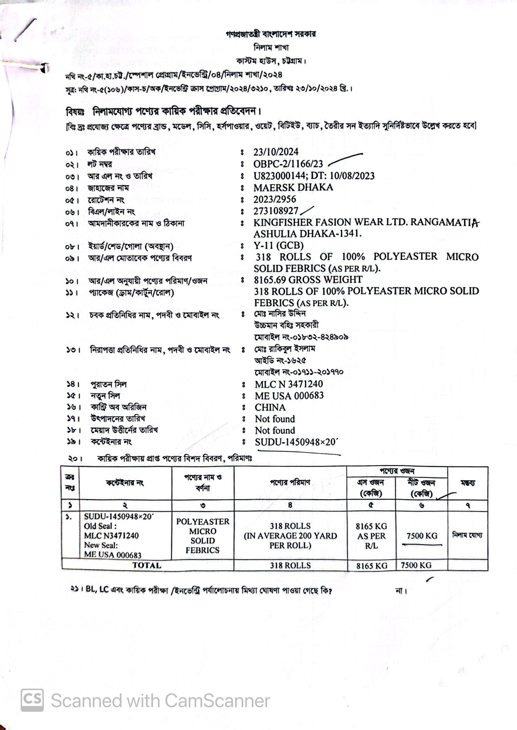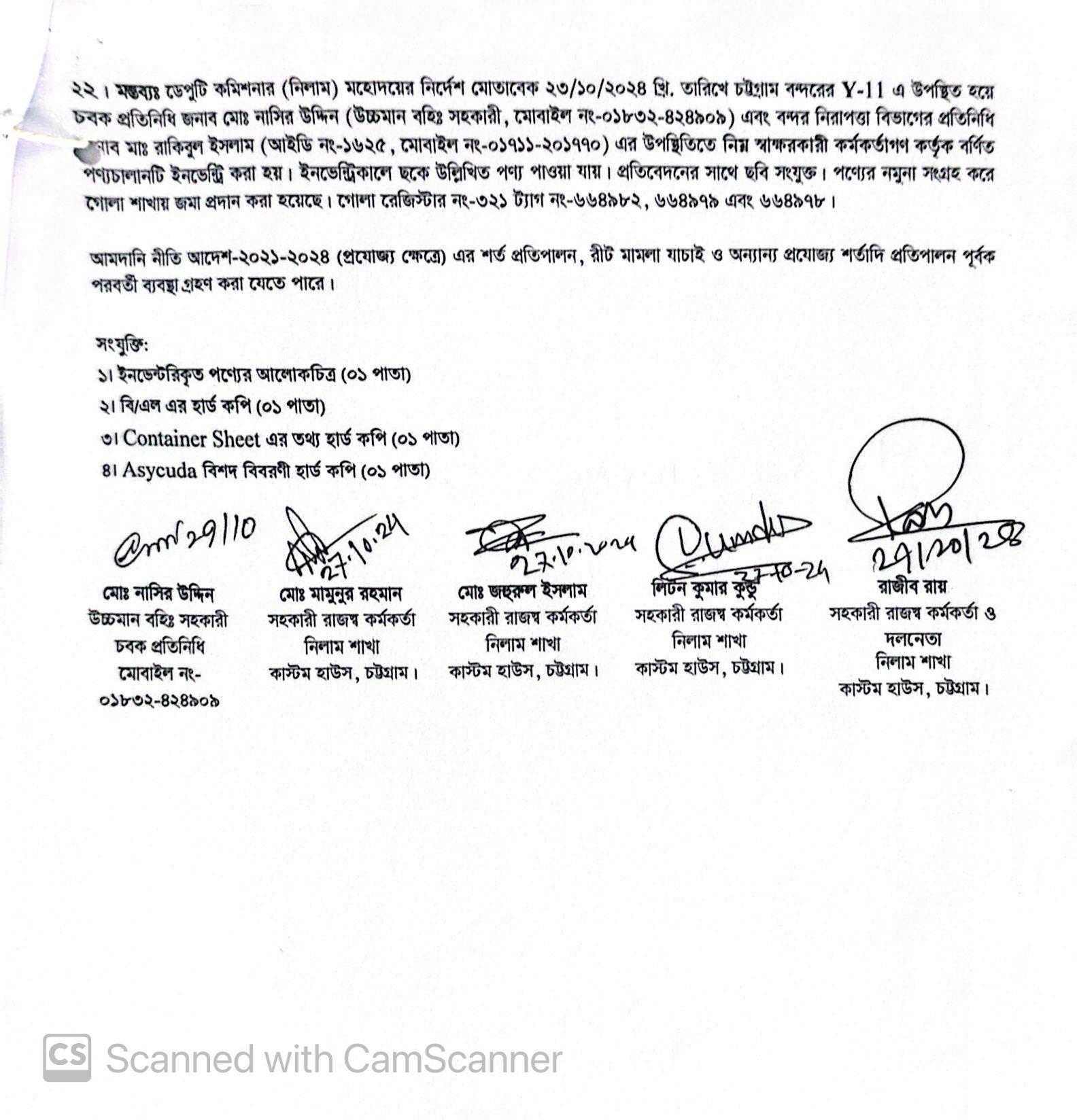Terms & condition : নিলাম বিজ্ঞপ্তিতে উল্লিখিত সময়ের মধ্যে সেখানে সে অবস্থায় আছে, সে অবস্থায় সরেজমিন পণ্য পরিদর্শন করে নিলামে অংশগ্রহণ করার জন্য আগ্রহী নিলাম ক্রেতাগণকে অনুরোধ করা যাচ্ছে। দরপত্র উন্মুক্ত করার পর নিলামে অংশগ্রহণকারী/বিডার কর্তৃক পণ্য সংক্রান্ত কোন আপত্তি/আবেদন গ্রহণযোগ্য হবে না। আমদানি নীতি আদেশ ২০২১-২০২৪, বিদ্যমান অন্যান্য আইন ও বিধি-বিধানের প্রযোজ্য সকল শর্ত যথাযথ পরিপালনপূর্বক, প্রযোজ্য ক্ষেত্রে রাসায়নিক পরীক্ষার মাধ্যমে নিলামে বিক্রয়যোগ্য পণ্যের সঠিকতা যাচাই ও ব্যবহার উপযোগিতা থাকা সাপেক্ষে এবং খালাসকালে পণ্যের বর্ণনা এবং ওজন নিশ্চিত করে পণ্য ছাড়যোগ্য হবে। কোনরূপ কারণ দর্শানো ব্যতিরেকে কর্তৃপক্ষ যে কোন সময় ও পর্যায়ে যে কোন লট বা সকল লটের নিলাম আংশিক বা সম্পূর্ণ স্থগিত বা বাতিল করার অধিকার সংরক্ষণ করেন।