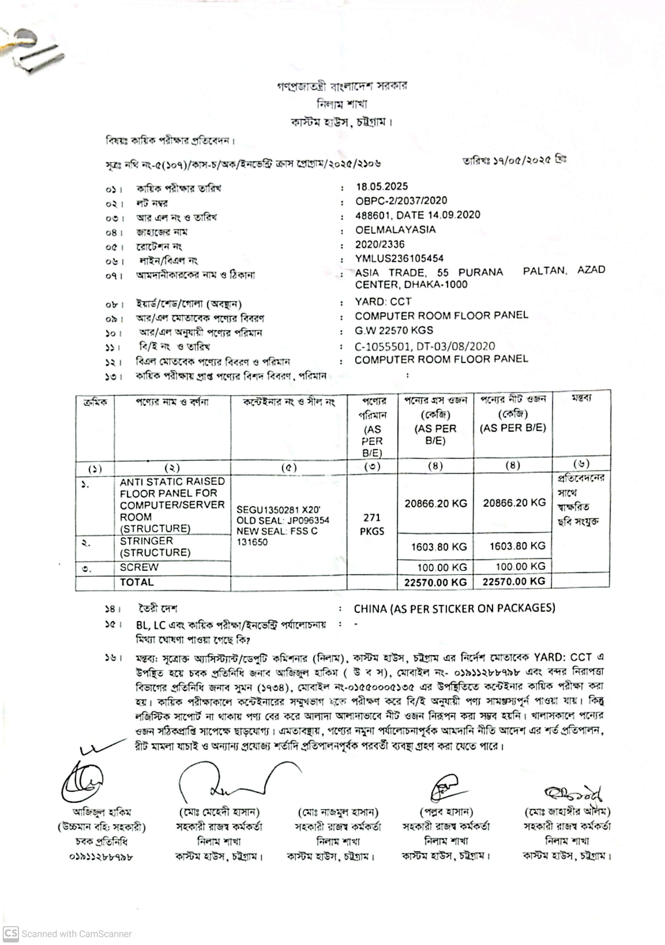 (1) Anti-Static Raised Floor Panel for Computer/Server Room (Structure)= 20,866.20 Kgs; (2) Stringer (Structure)= 1,603.80 Kgs; (3) Screw= 100.00 Kgs (As per BE). C/O: China (As per sticker on package) |
