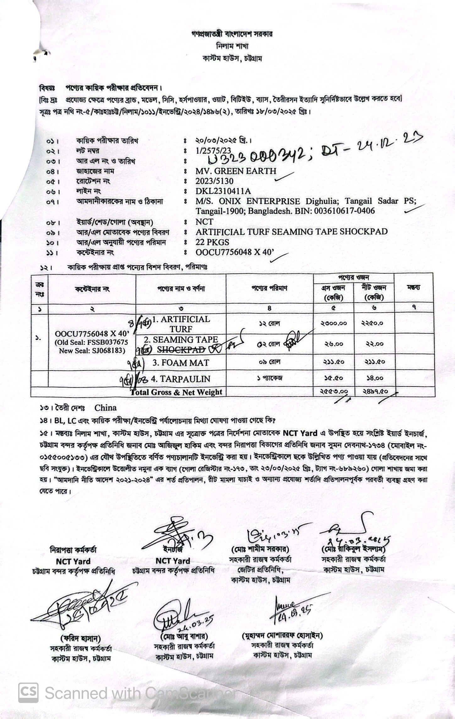 | কন্টেনার/জি আর নং |
