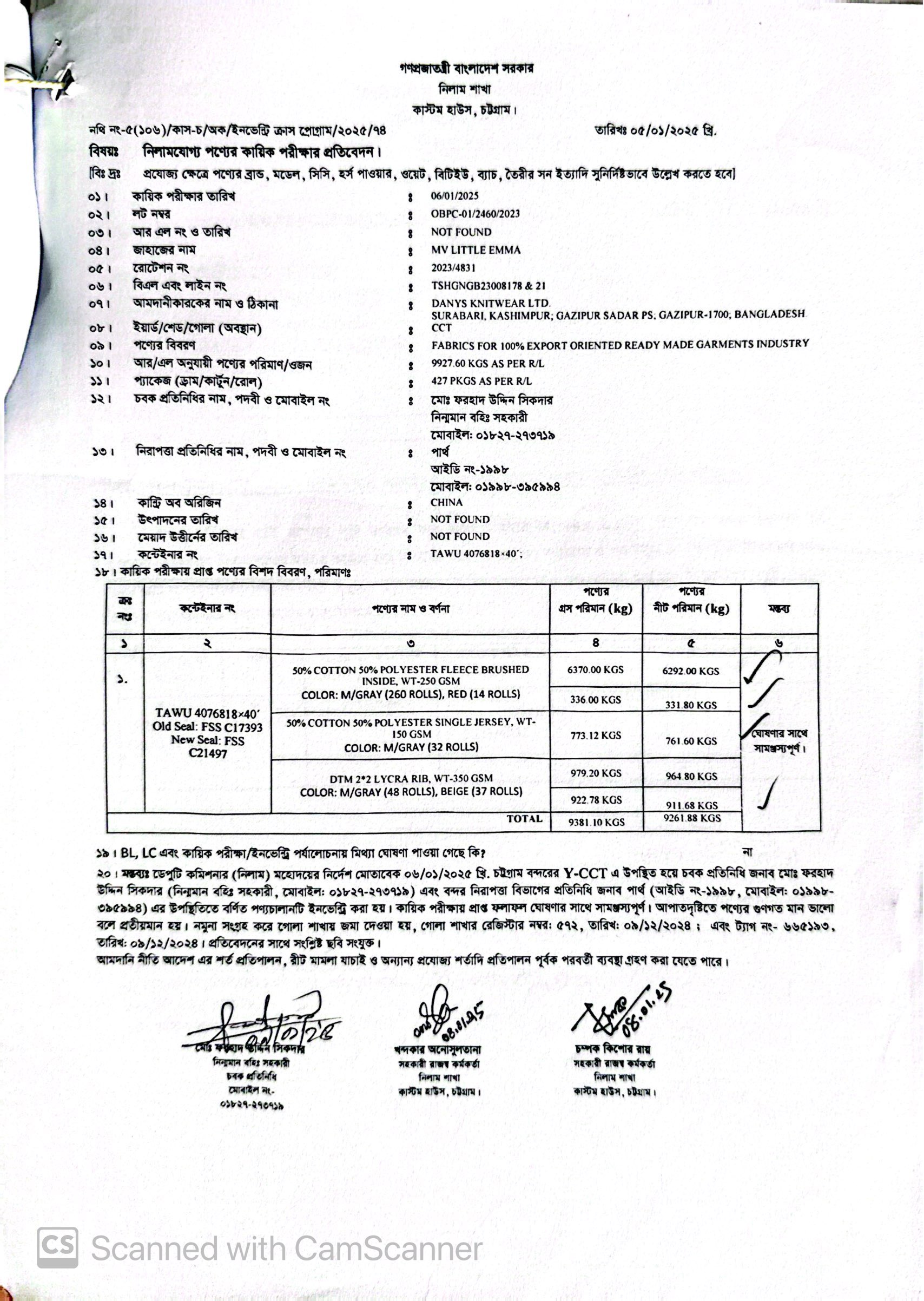 50% Cotton 50% Polyester Fleece Brushed Inside,WT-250gsm, Color- M/Gray(260 Rolls), RED (14 Rolls): 6,623.80 Kgs; 50% Cotton 50% Polyester Single Jersey WT-150 gsm, Color- M/Gray (32 Rolls): 761.60 Kgs; DTM 2*2 Lycra RIB, WT-350 gsm, Color- M/Gray (48 Rolls) Beige (37 Rolls): 1,876.48 Kgs |