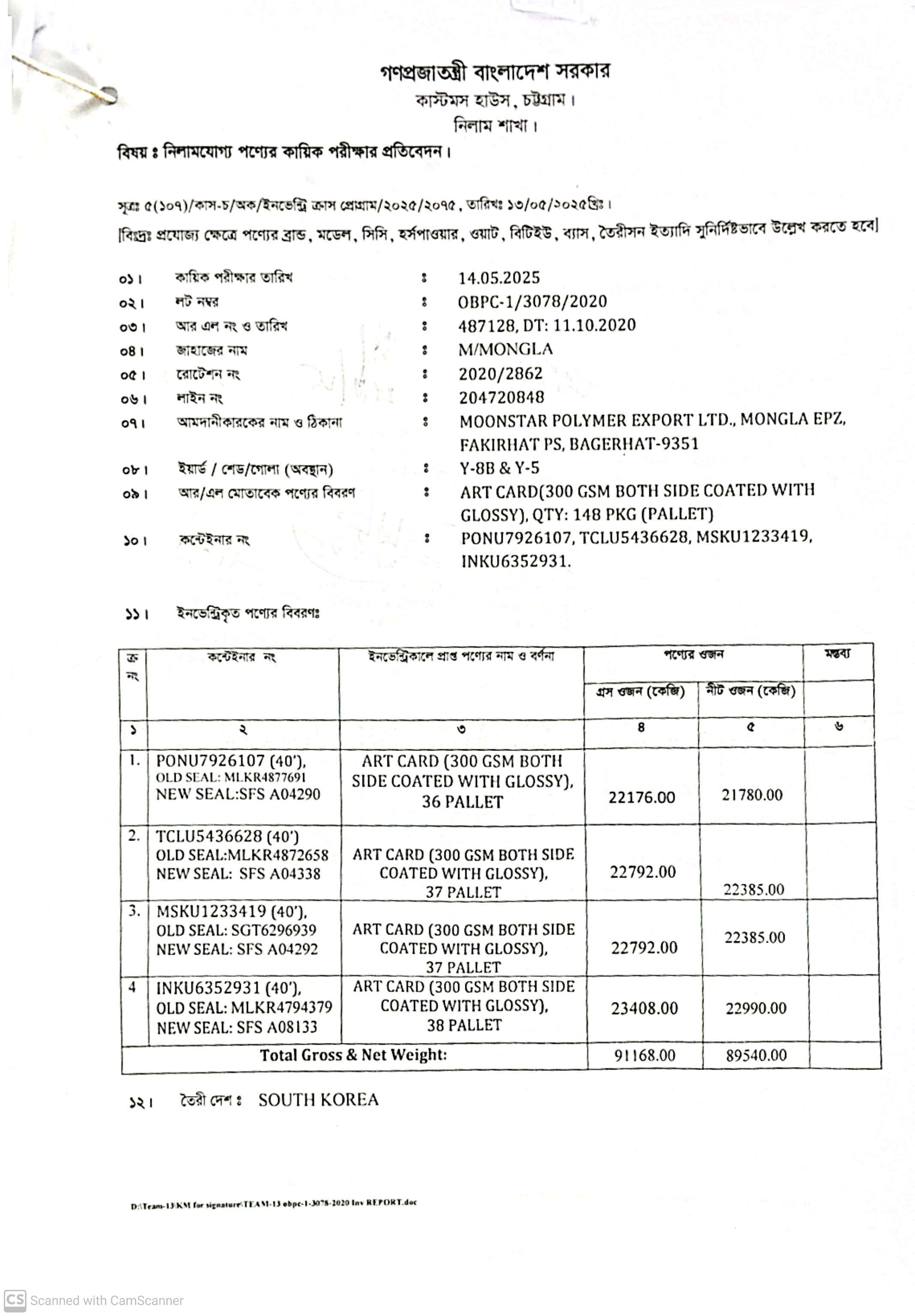 (1) Art Card (300 gsm both sides coated with glossy)- 36 pallet= 21,780 kg; (2) Art Card (300 gsm both sides coated with glossy)- 37 pallet= 22,385 kg; (3) Art Card (300 gsm both sides coated with glossy)- 37 pallet= 22,385 kg & (4) Art Card (300 gsm both sides coated with glossy)- 38 pallet= 22,990 kg. C/O: South Korea |