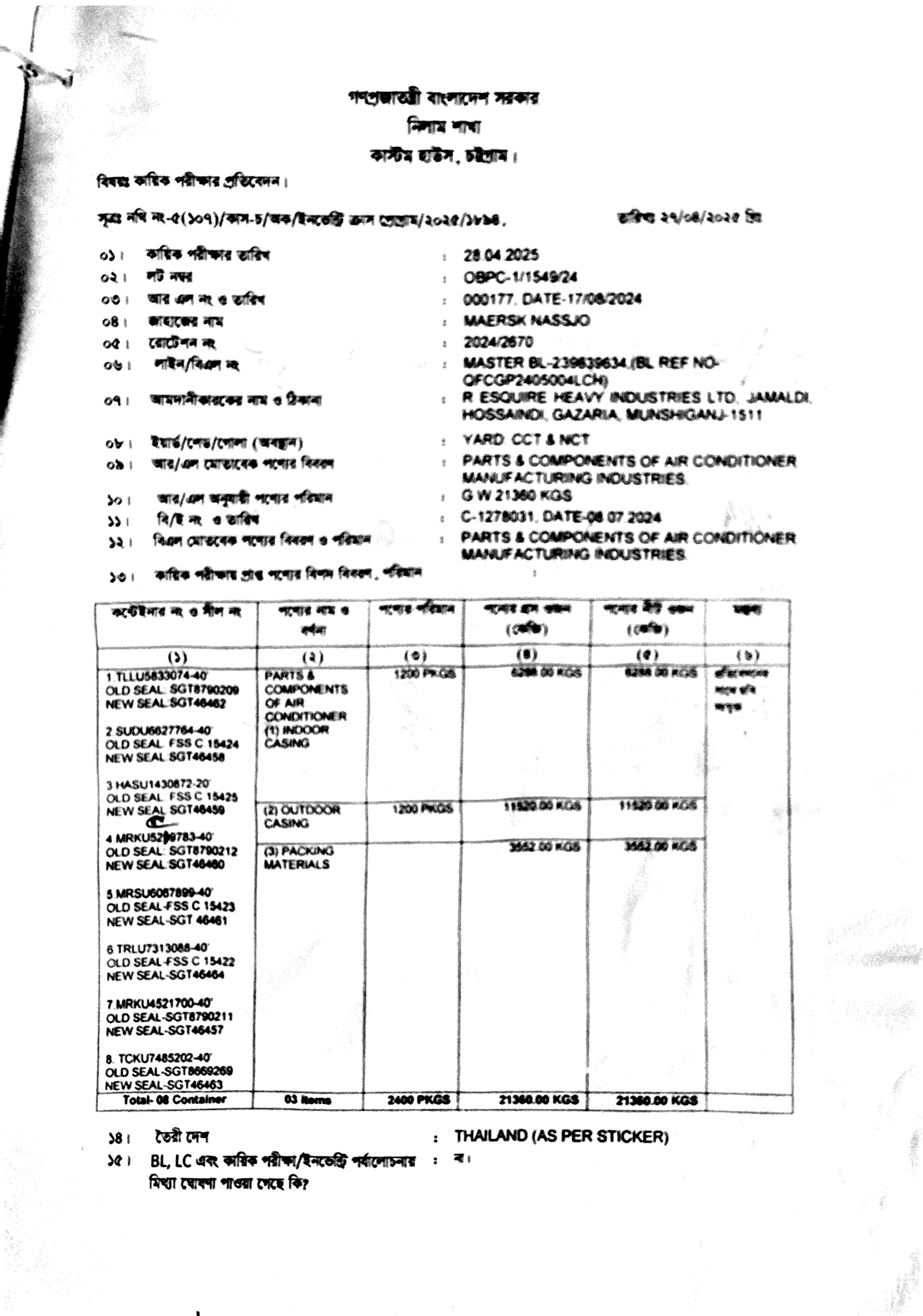 Parts & Components of Air Conditioner (1) Indoor Casing= 6,288.00 Kg, Parts & Components of Air Conditioner (2) Outdoor Casing= 11,520.00 kg & Packing Materials= 3,552.00 |
