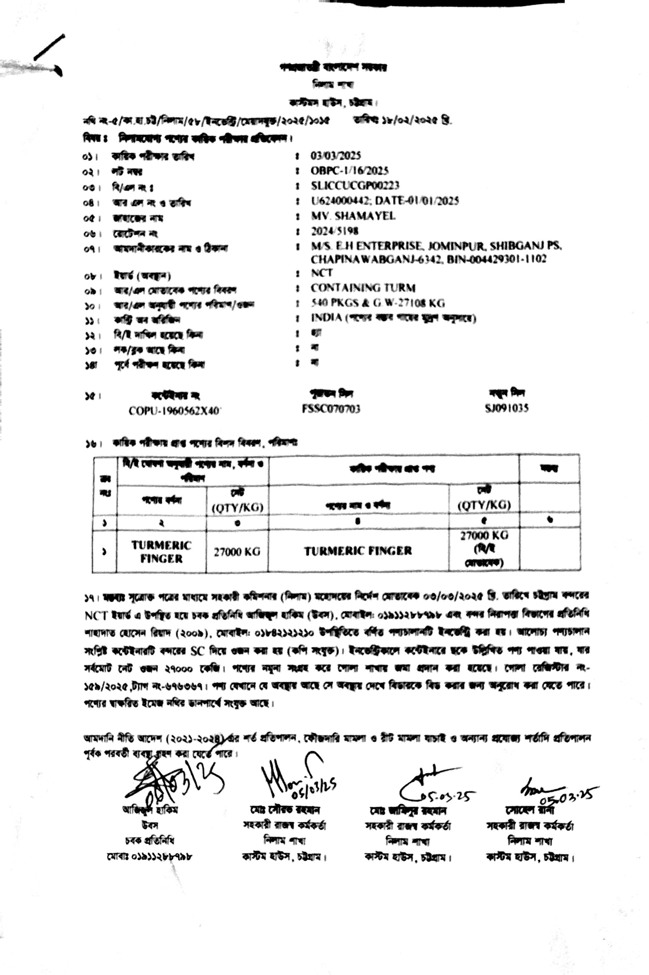 Terms & condition : আমদানি নীতি আদেশ এবং বিদ্যমান অন্যান্য আইন ও বিধি-বিধানের প্রযোজ্য সকল শর্ত পরিপালন সাপেক্ষে পণ্য ছাড়যোগ্য হবে। প্রযোজ্য ক্ষেত্রে রাসায়নিক পরীক্ষায় পণ্যের সঠিকতা ও ব্যবহার উপযোগিতা থাকা সাপেক্ষে পণ্য ছাড়যোগ্য হবে। কোনরূপ কারণ দর্শানো ব্যতিরেকে কর্তৃপক্ষ যে কোন সময় ও পর্যায়ে যে কোন লট বা সকল লটের নিলাম আংশিক বা সম্পূর্ণ স্থগিত বা বাতিল করার অধিকার সংরক্ষণ করেন।