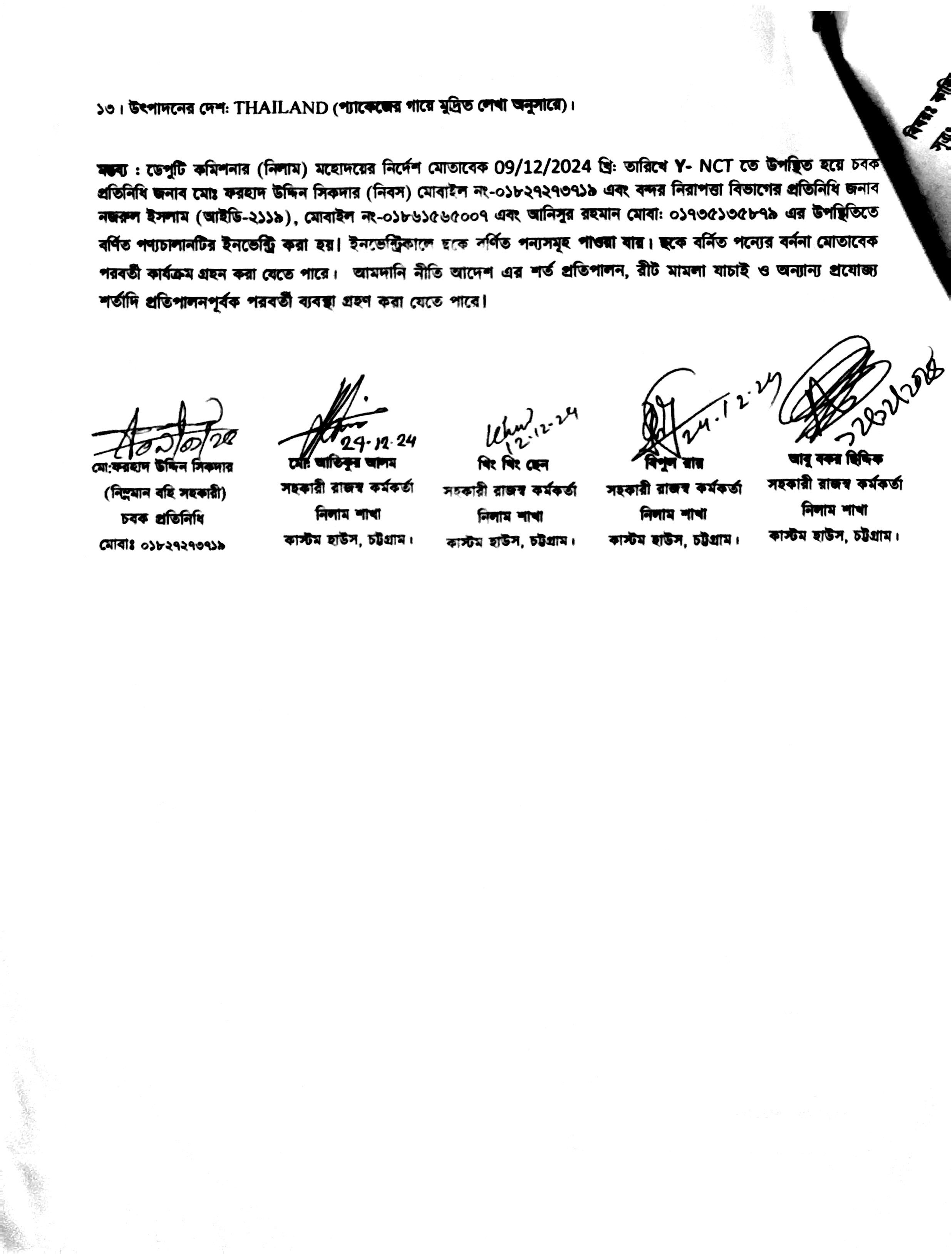 Terms & condition : আমদানি নীতি আদেশ এবং বিদ্যমান অন্যান্য আইন ও বিধি-বিধানের প্রযোজ্য সকল শর্ত পরিপালন সাপেক্ষে পণ্য ছাড়যোগ্য হবে। প্রযোজ্য ক্ষেত্রে রাসায়নিক পরীক্ষায় পণ্যের সঠিকতা ও ব্যবহার উপযোগিতা থাকা সাপেক্ষে পণ্য ছাড়যোগ্য হবে। কোনরূপ কারণ দর্শানো ব্যতিরেকে কর্তৃপক্ষ যে কোন সময় ও পর্যায়ে যে কোন লট বা সকল লটের নিলাম আংশিক বা সম্পূর্ণ স্থগিত বা বাতিল করার অধিকার সংরক্ষণ করেন।