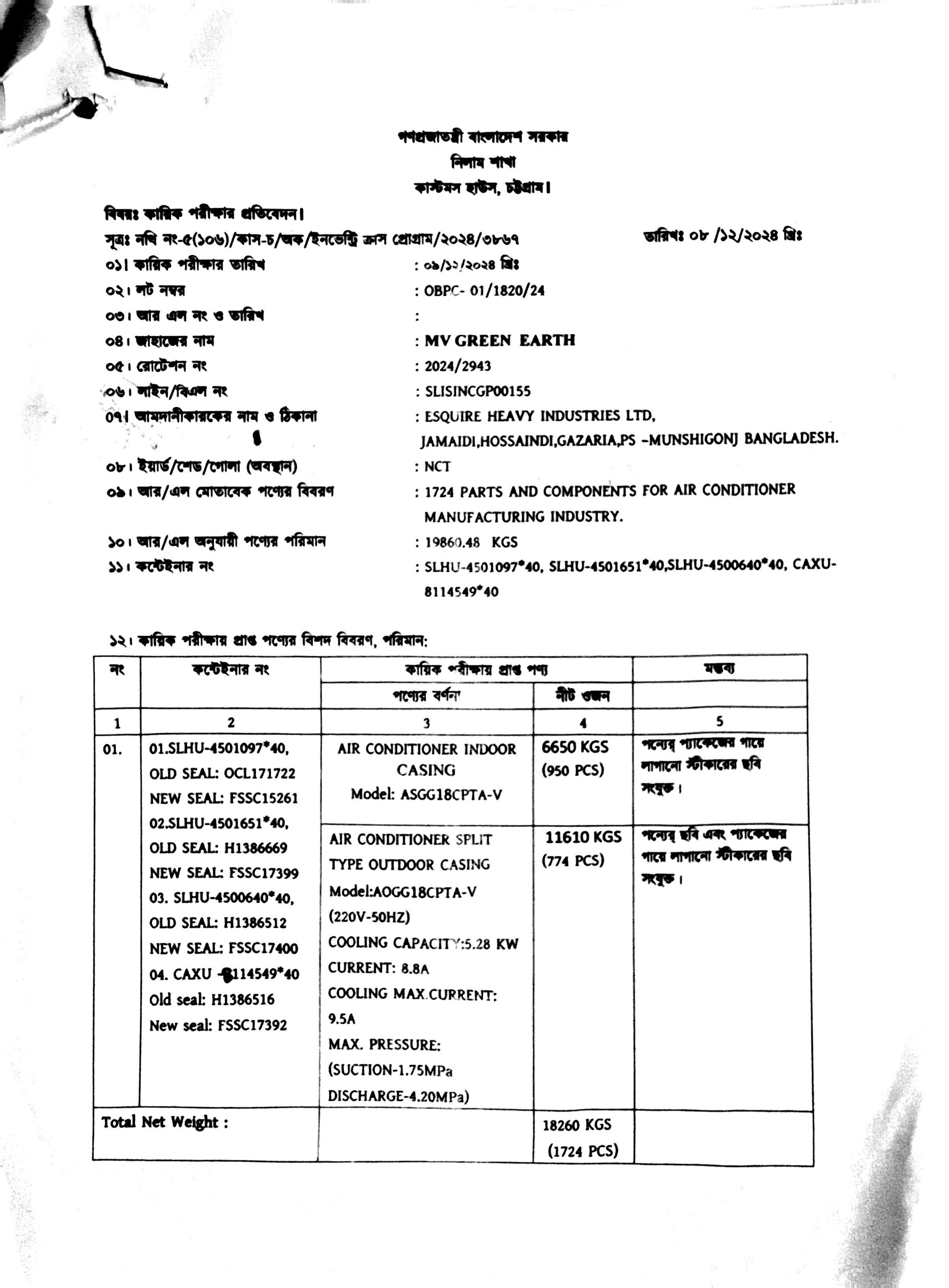 লটের শিরোনাম :Air Conditioner (1) Indoor Casing Model: ASGG18COTA-V= 6,650.00 kg, Air Conditioner Split Type Outdoor Casing Model: A0GG18CPTA-V= 11,610.00 kg(Previous Bid: 0 TK)