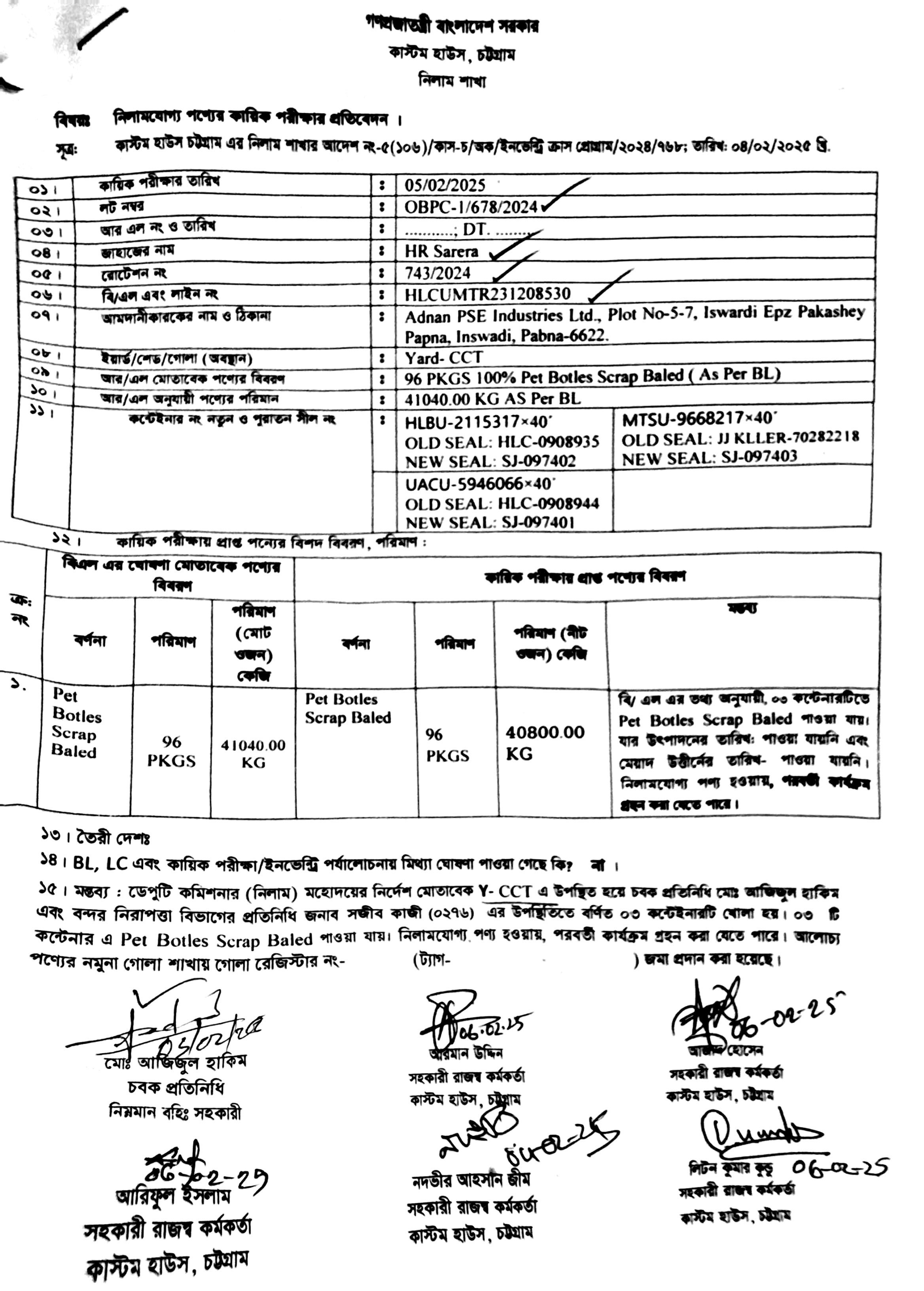 Terms & condition : আমদানি নীতি আদেশ এবং বিদ্যমান অন্যান্য আইন ও বিধি-বিধানের প্রযোজ্য সকল শর্ত পরিপালন সাপেক্ষে পণ্য ছাড়যোগ্য হবে। প্রযোজ্য ক্ষেত্রে রাসায়নিক পরীক্ষায় পণ্যের সঠিকতা ও ব্যবহার উপযোগিতা থাকা সাপেক্ষে পণ্য ছাড়যোগ্য হবে। কোনরূপ কারণ দর্শানো ব্যতিরেকে কর্তৃপক্ষ যে কোন সময় ও পর্যায়ে যে কোন লট বা সকল লটের নিলাম আংশিক বা সম্পূর্ণ স্থগিত বা বাতিল করার অধিকার সংরক্ষণ করেন।