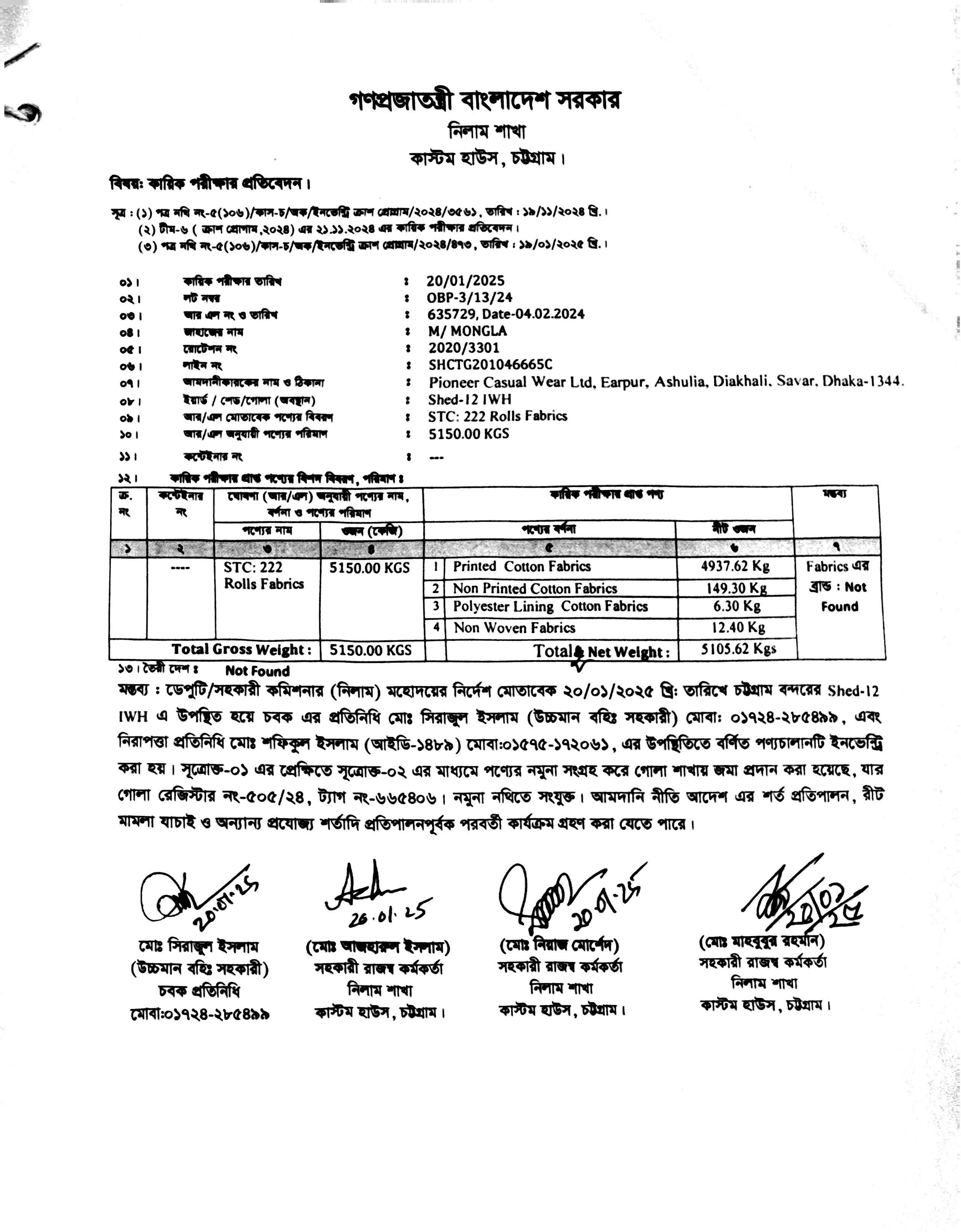 লটের শিরোনাম :Printed Cotton Fabrics= 4,937.62 kg, Non-Printed Cotton Fabrics= 149.30, Polyester Lining Fabrics=6.30 & Non-Woven Fabrics= 12.40(Previous Bid: 0 TK)