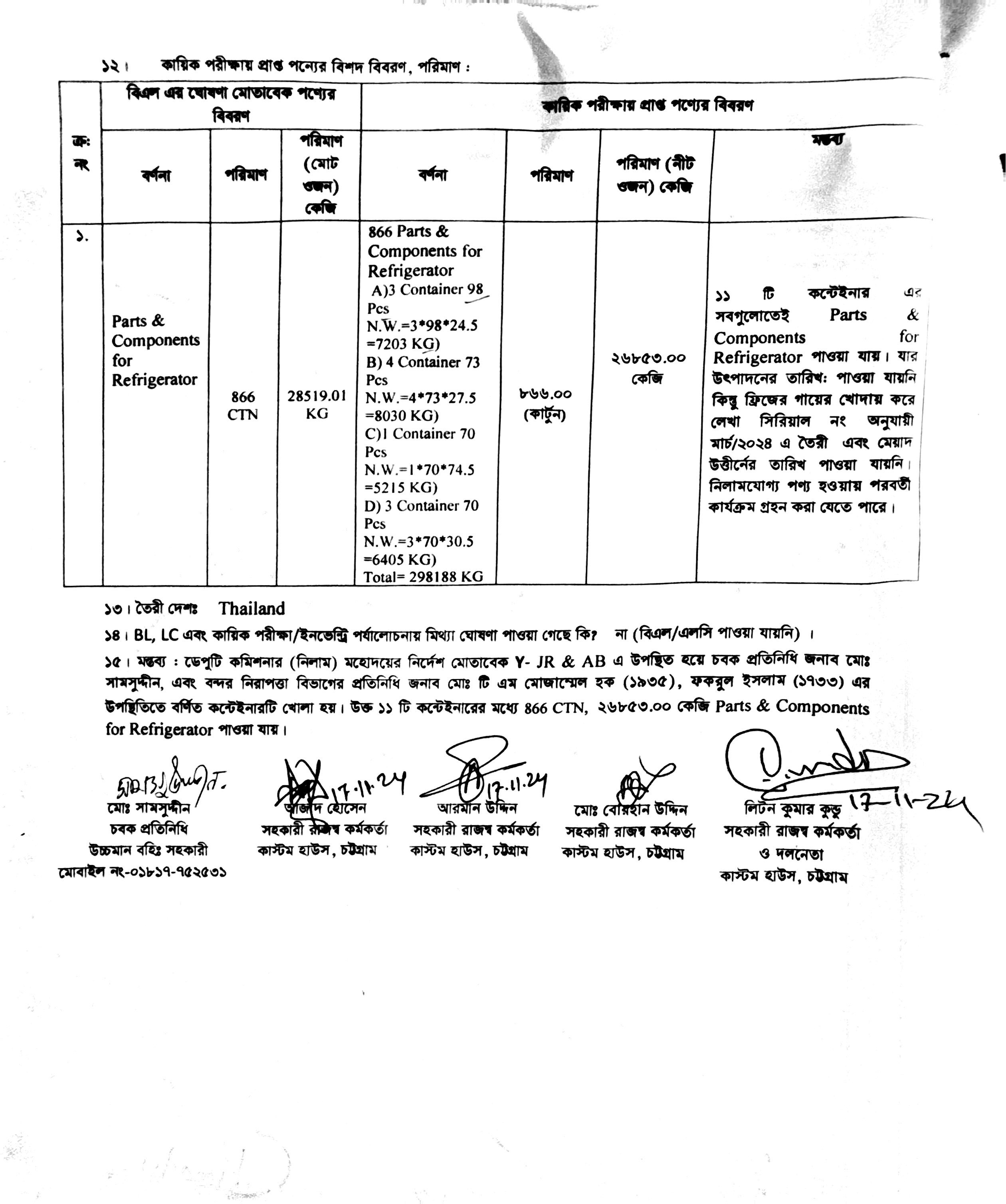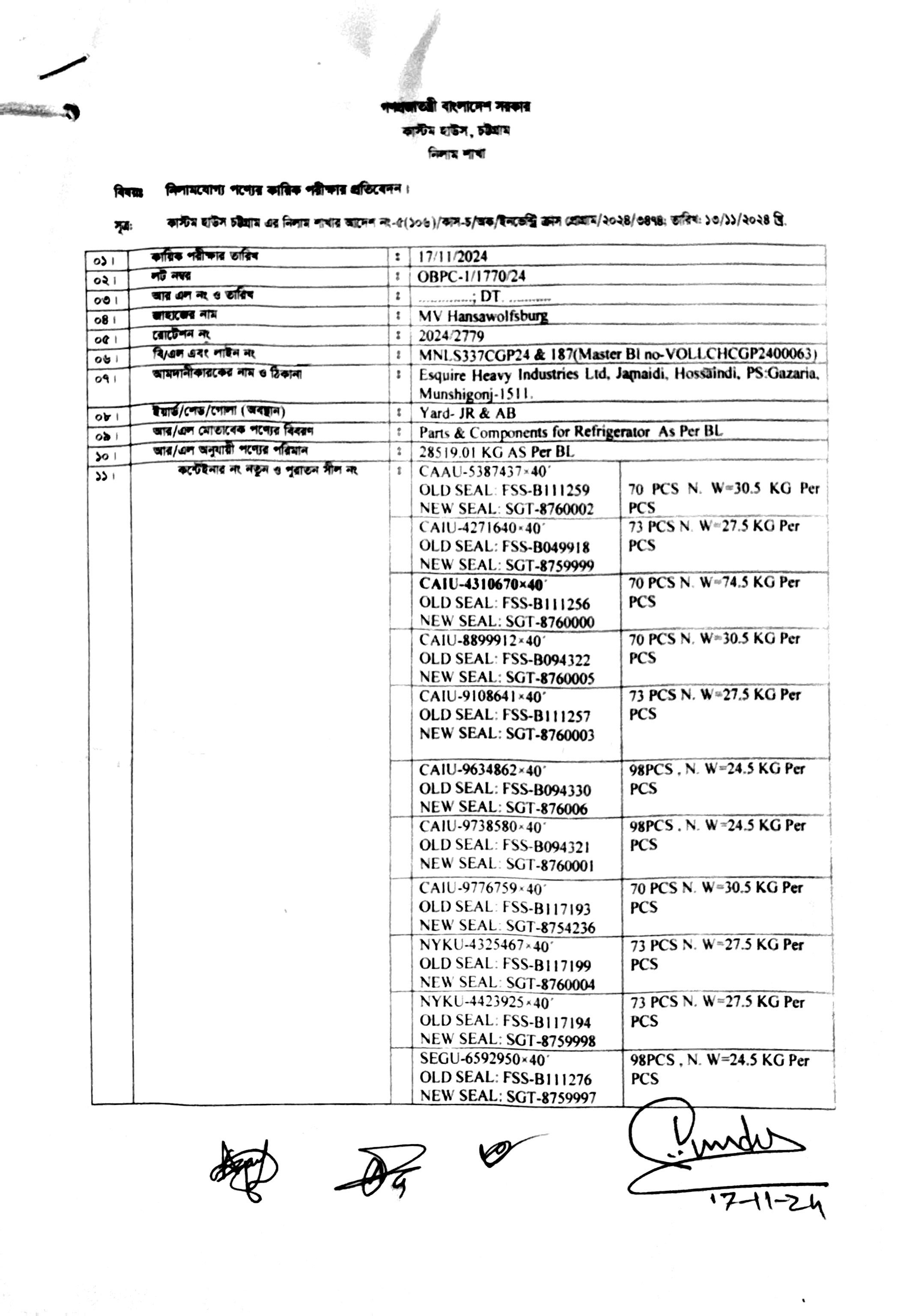 Terms & condition : আমদানি নীতি আদেশ এবং বিদ্যমান অন্যান্য আইন ও বিধি-বিধানের প্রযোজ্য সকল শর্ত পরিপালন সাপেক্ষে পণ্য ছাড়যোগ্য হবে। প্রযোজ্য ক্ষেত্রে রাসায়নিক পরীক্ষায় পণ্যের সঠিকতা ও ব্যবহার উপযোগিতা থাকা সাপেক্ষে পণ্য ছাড়যোগ্য হবে। কোনরূপ কারণ দর্শানো ব্যতিরেকে কর্তৃপক্ষ যে কোন সময় ও পর্যায়ে যে কোন লট বা সকল লটের নিলাম আংশিক বা সম্পূর্ণ স্থগিত বা বাতিল করার অধিকার সংরক্ষণ করেন।