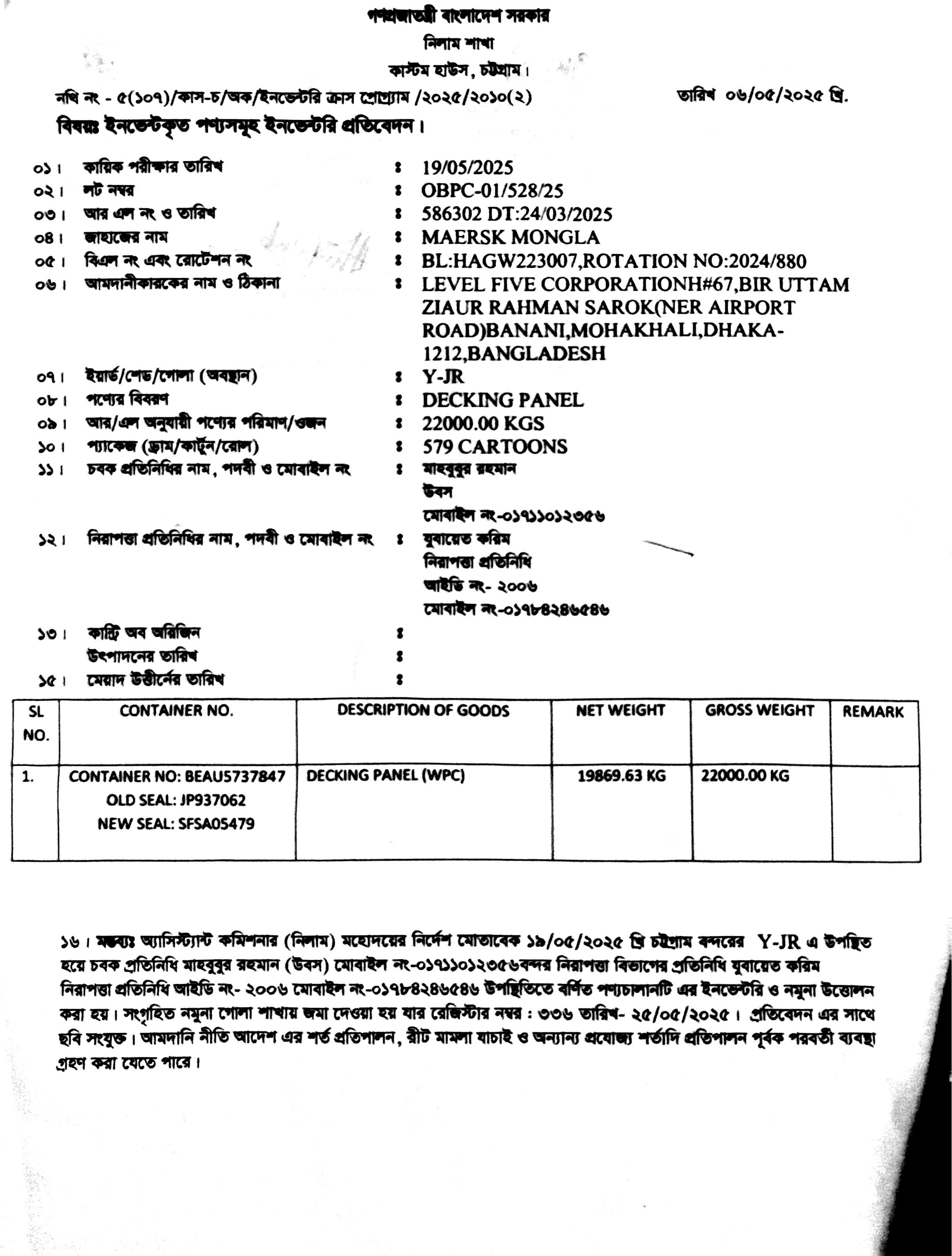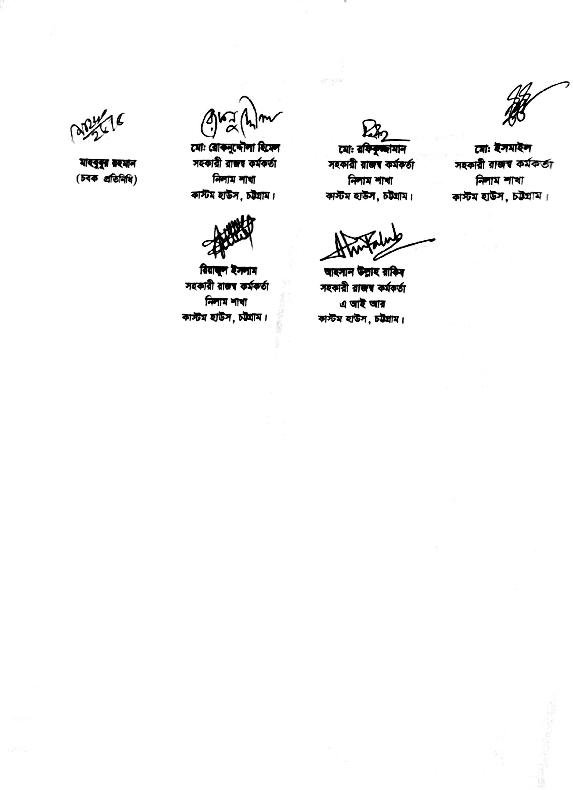 Terms & condition : আমদানি নীতি আদেশ এবং বিদ্যমান অন্যান্য আইন ও বিধি-বিধানের প্রযোজ্য সকল শর্ত পরিপালন সাপেক্ষে পণ্য ছাড়যোগ্য হবে। প্রযোজ্য ক্ষেত্রে রাসায়নিক পরীক্ষায় পণ্যের সঠিকতা ও ব্যবহার উপযোগিতা থাকা সাপেক্ষে পণ্য ছাড়যোগ্য হবে। কোনরূপ কারণ দর্শানো ব্যতিরেকে কর্তৃপক্ষ যে কোন সময় ও পর্যায়ে যে কোন লট বা সকল লটের নিলাম আংশিক বা সম্পূর্ণ স্থগিত বা বাতিল করার অধিকার সংরক্ষণ করেন।