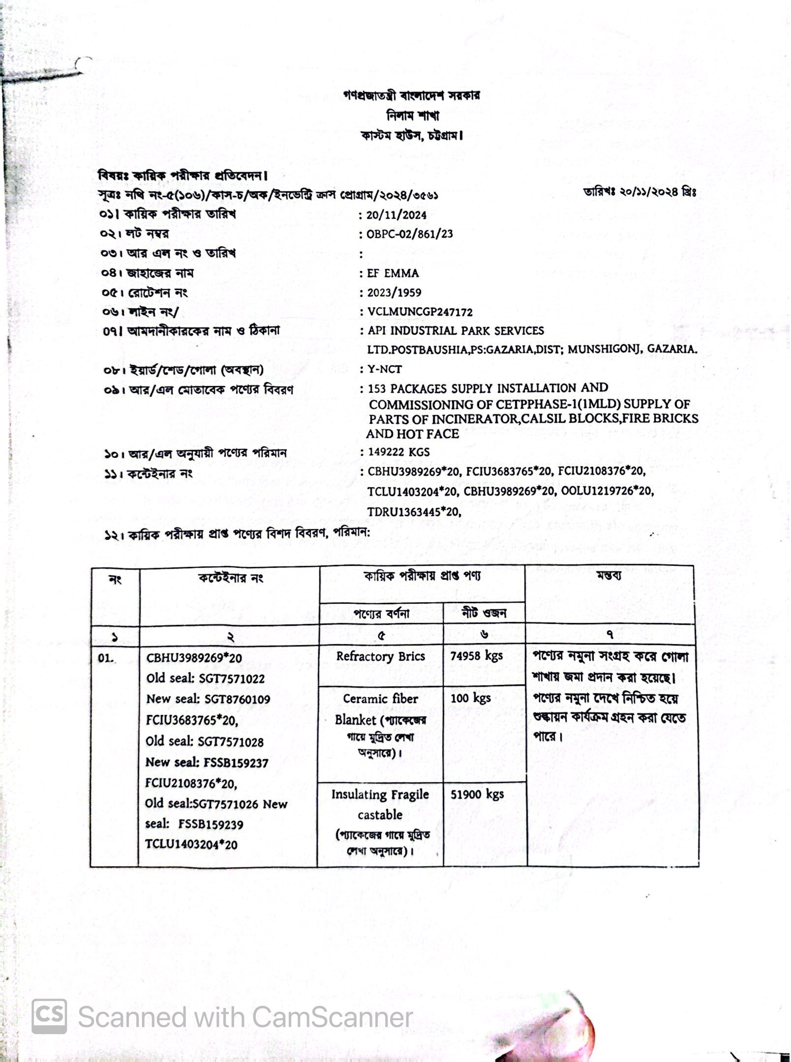 লটের শিরোনাম :(1) Refractory Bricks; (2) Ceramic Fiber Blanket; (3) Insulating Fragile Castable; (4) Insulation Bricks; (5) Fire Resistance White Bricks; (6) AR Tiles; (7) Bituminous Cold Applied Clay Type.(Previous Bid: 0 TK)