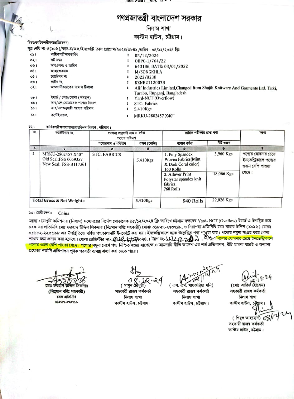 Terms & condition : আমদানি নীতি আদেশ এবং বিদ্যমান অন্যান্য আইন ও বিধি-বিধানের প্রযোজ্য সকল শর্ত পরিপালন এবং প্রযোজ্য ক্ষেত্রে রাসায়নিক পরীক্ষায় পণ্যের সঠিকতা ও ব্যবহার উপযোগিতা থাকা সাপেক্ষে খালাসকালে পণ্যের বর্ণনা এবং ওজন নিশ্চিত করে পণ্য ছাড়যোগ্য হবে। কোন লটভুক্ত পণ্যচালানে মেয়াদ উত্তীর্ণ/ধ্বসংযোগ্য পণ্য অন্তর্ভুক্ত থাকলে, উক্ত পণ্যচালানের ক্ষেত্রে মেয়াদ উত্তীর্ণ/ধ্বসংযোগ্য পণ্য ব্যতীত (প্রযোজ্য ক্ষেত্রে) কেবল মেয়াদযুক্ত/নিলামযোগ্য পণ্যসমূহ বিদ্যমান ও প্রযোজ্য আইন ও বিধি-বিধানের প্রযোজ্য সকল শর্ত পরিপালন সাপেক্ষে পণ্য ছাড়যোগ্য হবে। সার্ভার জটিলতা এড়ানোর জন্য আগ্রহী নিলাম ক্রেতাগণকে সরেজমিন পণ্য দেখে নিলামের নির্ধারিত শেষ তারিখ ও সময়ের (২৭/১১/২০২৫ খ্রি. তারিখ বিকাল ০৪.০০ টা) পূর্বেই বিশেষ ই-নিলামে অংশগ্রহণ করার জন্য অনুরোধ করা যাচ্ছে। কোনরূপ কারণ দর্শানো ব্যতিরেকে কর্তৃপক্ষ যে কোন সময় ও পর্যায়ে যে কোন লট বা সকল লটের নিলাম আংশিক বা সম্পূর্ণ স্থগিত বা বাতিলের অধিকার সংরক্ষণ করেন।