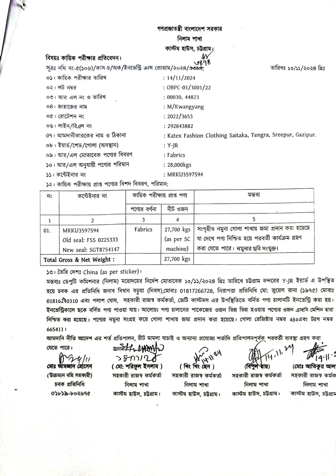 Terms & condition : নিলাম বিজ্ঞপ্তিতে উল্লিখিত সময়ের মধ্যে সেখানে সে অবস্থায় আছে, সে অবস্থায় সরেজমিন পণ্য পরিদর্শন করে নিলামে অংশগ্রহণ করার জন্য আগ্রহী নিলাম ক্রেতাগণকে অনুরোধ করা যাচ্ছে। দরপত্র উন্মুক্ত করার পর নিলামে অংশগ্রহণকারী/বিডার কর্তৃক পণ্য সংক্রান্ত কোন আপত্তি/আবেদন গ্রহণযোগ্য হবে না। আমদানি নীতি আদেশ ২০২১-২০২৪, বিদ্যমান অন্যান্য আইন ও বিধি-বিধানের প্রযোজ্য সকল শর্ত যথাযথ পরিপালনপূর্বক, প্রযোজ্য ক্ষেত্রে রাসায়নিক পরীক্ষার মাধ্যমে নিলামে বিক্রয়যোগ্য পণ্যের সঠিকতা যাচাই ও ব্যবহার উপযোগিতা থাকা সাপেক্ষে এবং খালাসকালে পণ্যের বর্ণনা এবং ওজন নিশ্চিত করে পণ্য ছাড়যোগ্য হবে। কোনরূপ কারণ দর্শানো ব্যতিরেকে কর্তৃপক্ষ যে কোন সময় ও পর্যায়ে যে কোন লট বা সকল লটের নিলাম আংশিক বা সম্পূর্ণ স্থগিত বা বাতিল করার অধিকার সংরক্ষণ করেন।