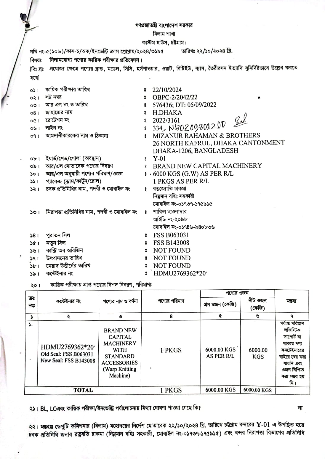 | কন্টেনার/জি আর নং |