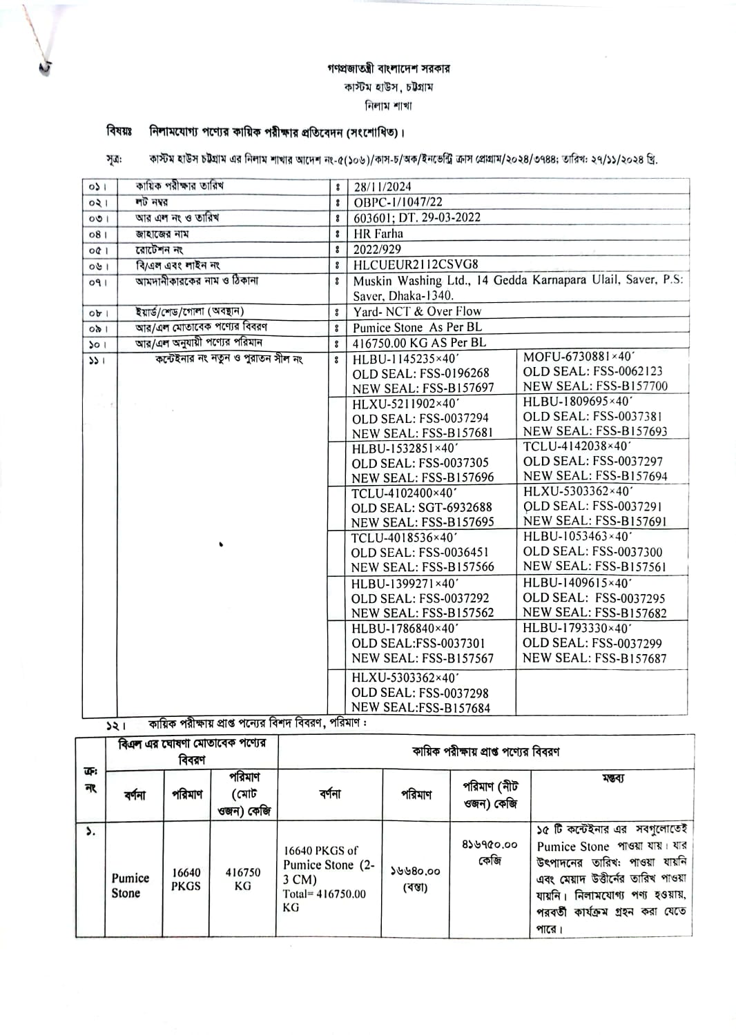 নিলামের পণ্য প্রদর্শনের তারিখ ২০/০৭/২০২৫ থেকে ৩১/০৭/২০২৫