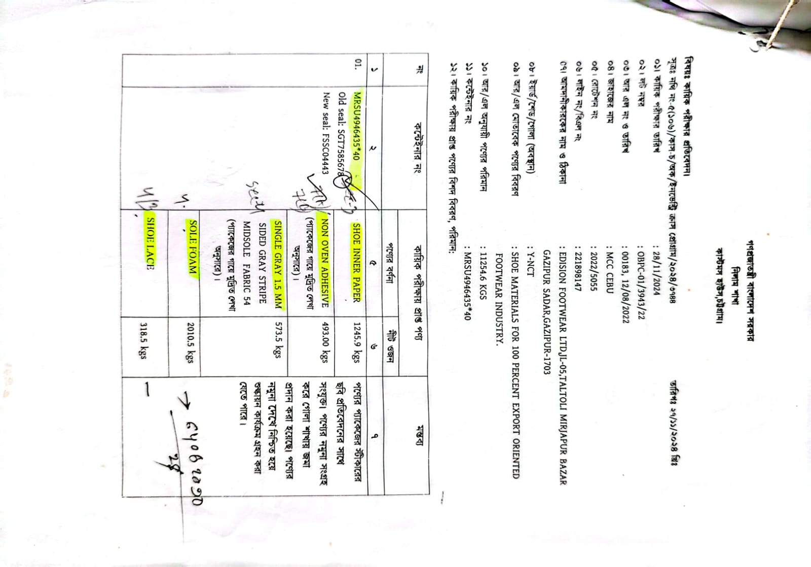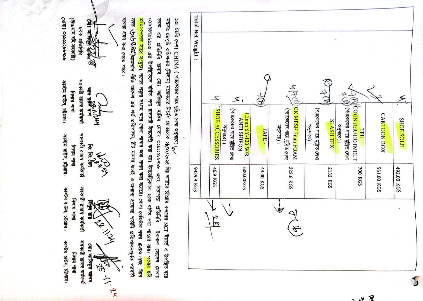Shoe Inner Paper: 1,245.90 Kg; Non-Woven Adhesive: 493 Kg; Single Gray 1.5 mm sided Gray Stripe Midsole Fabric 54: 573.50 Kg; Sole Foam: 2,010.50 Kg; Shoe Lace: 318.50 Kg; Shoe Sole: 492 Kg; Carton Box: 561 Kg; TPU Counter + Hotmelt: 700 Kg; Slash Tex: 2,132 Kg; CK Mesh 2mm Foam: 222.60 Kg; Tape: 44 Kg; 1.2mm SY-120 W/R Anti Shipon: 600 Kg; Shoe Accessories: 46.90 Kg |