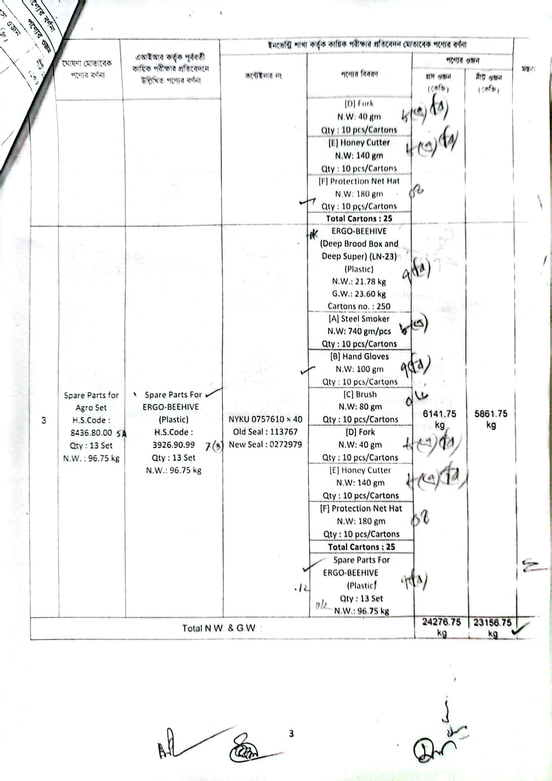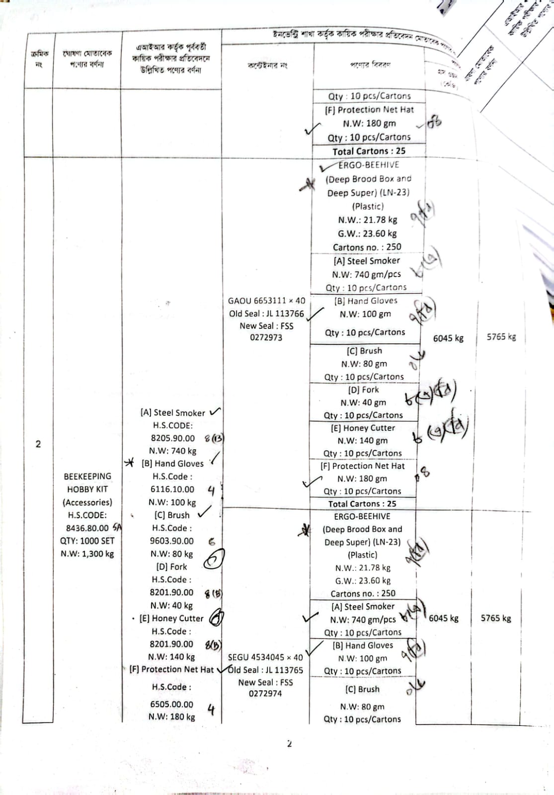 Hand Gloves-100 Kgs; Protection Net Hat-180 Kgs ERGO-BEEHIVE (Deep Board Box and Deep Supper) Plastic- 21780 Kgs; Spare Parts for Ergo Beehive Plastic- 96.75 Kgs; Brush (1 Pcs)- 80 Kgs; Steel Smoker- 740 Kg; Fork- 40 Kg Honey Cutter- 140 Kgs; |