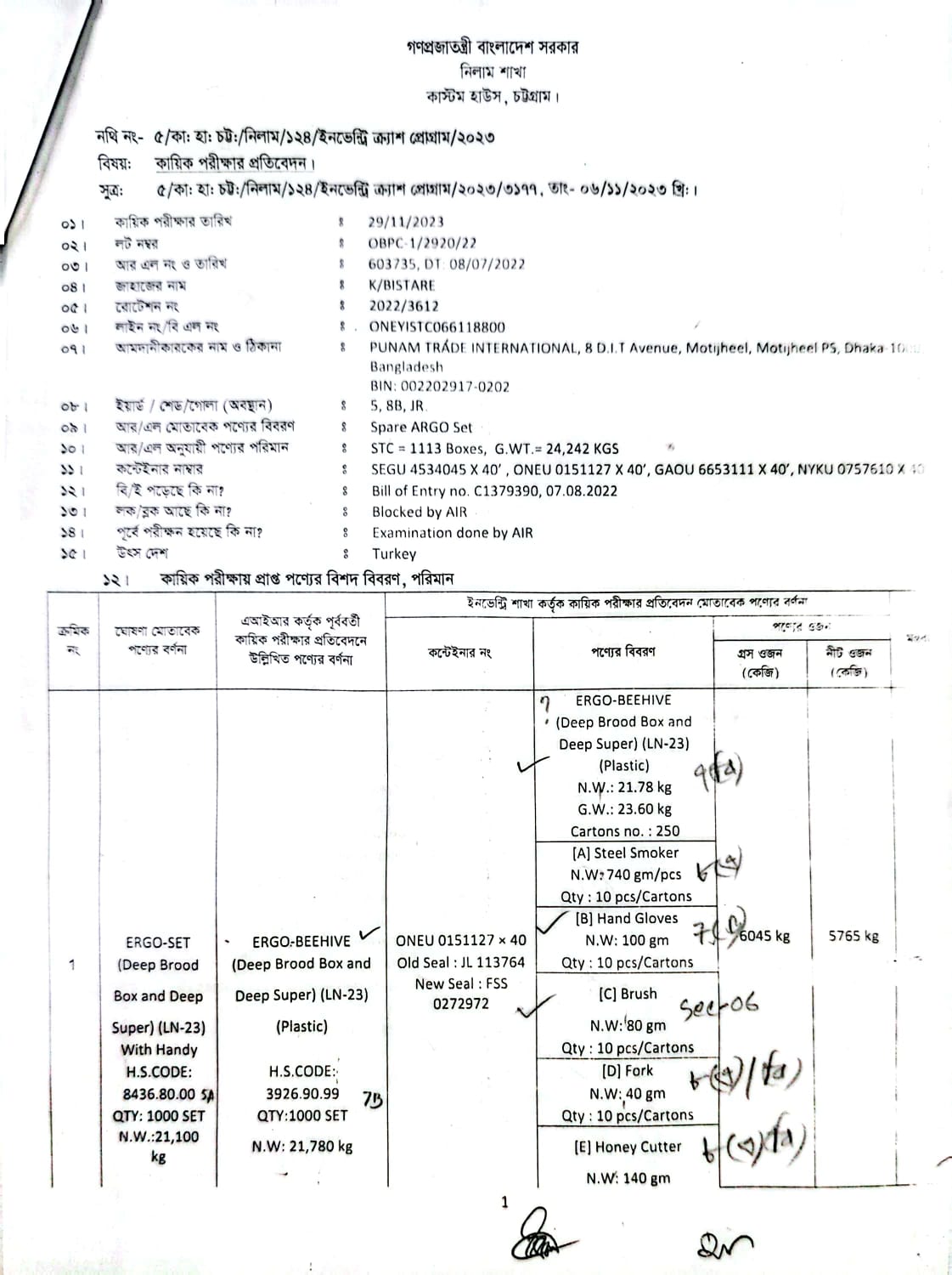 | কন্টেনার/জি আর নং |