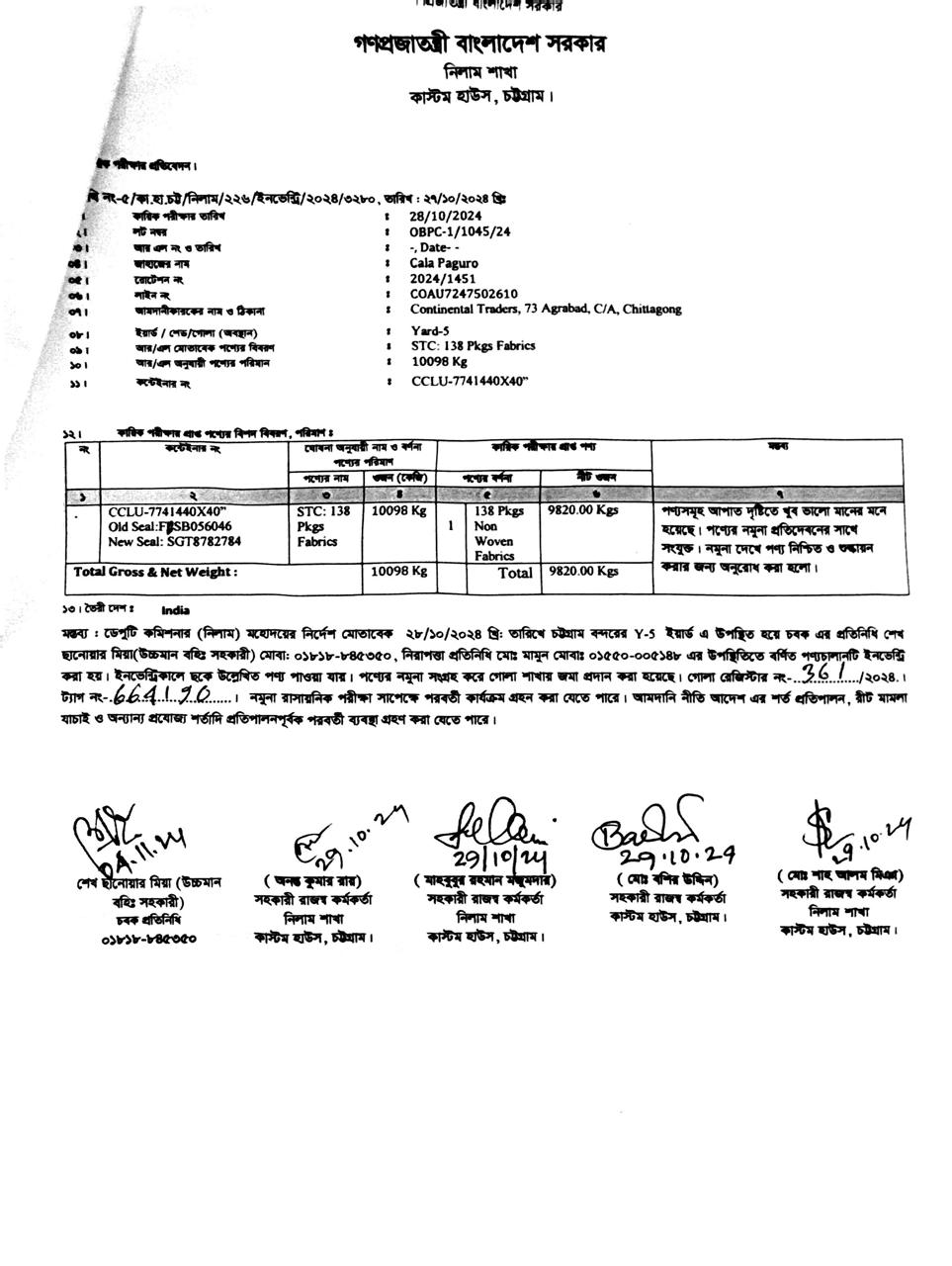 Terms & condition : আমদানি নীতি আদেশ এবং বিদ্যমান অন্যান্য আইন ও বিধি-বিধানের প্রযোজ্য সকল শর্ত পরিপালন সাপেক্ষে পণ্য ছাড়যোগ্য হবে। প্রযোজ্য ক্ষেত্রে রাসায়নিক পরীক্ষায় পণ্যের সঠিকতা ও ব্যবহার উপযোগিতা থাকা সাপেক্ষে পণ্য ছাড়যোগ্য হবে। কোনরূপ কারণ দর্শানো ব্যতিরেকে কর্তৃপক্ষ যে কোন সময় ও পর্যায়ে যে কোন লট বা সকল লটের নিলাম আংশিক বা সম্পূর্ণ স্থগিত বা বাতিল করার অধিকার সংরক্ষণ করেন।