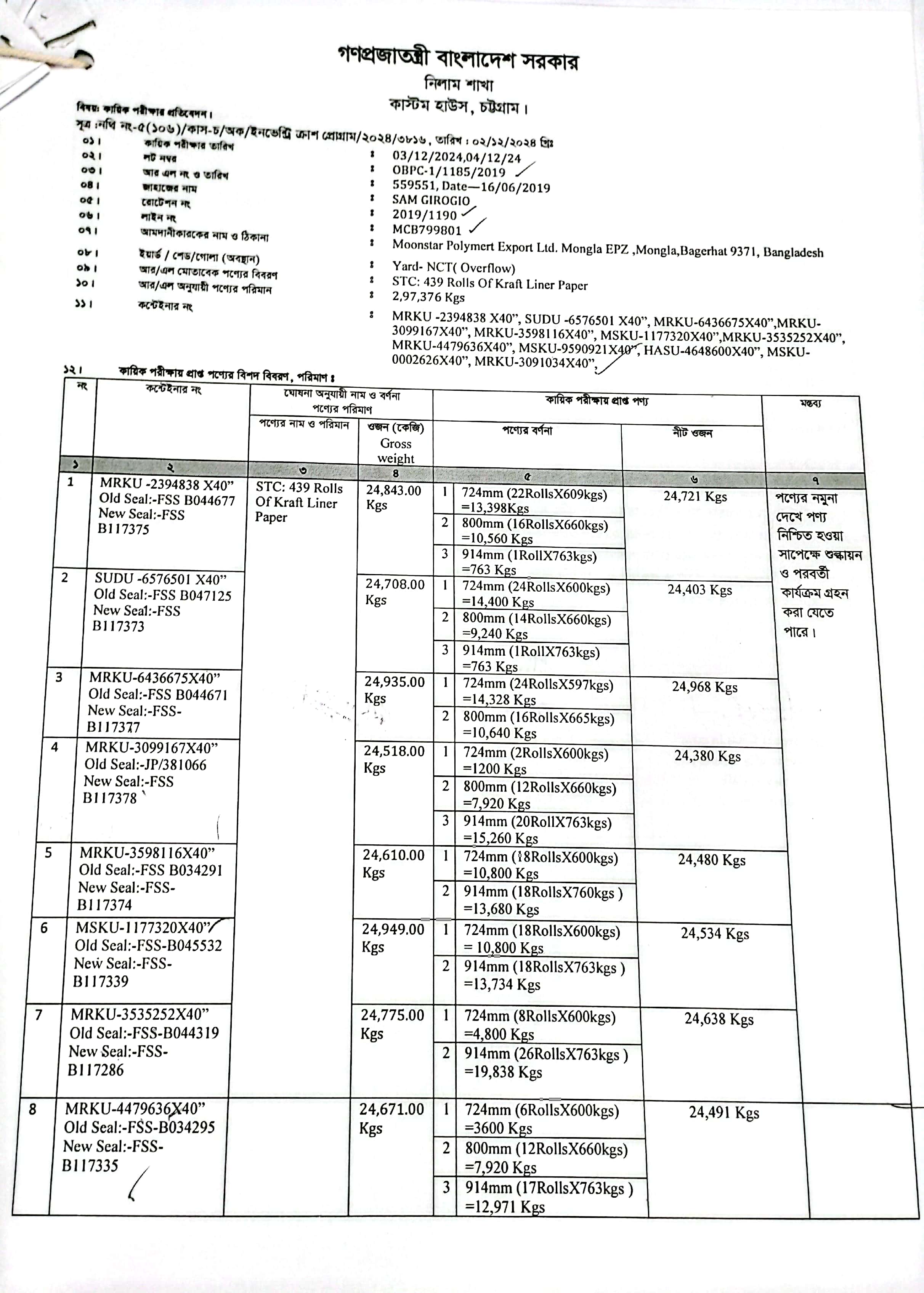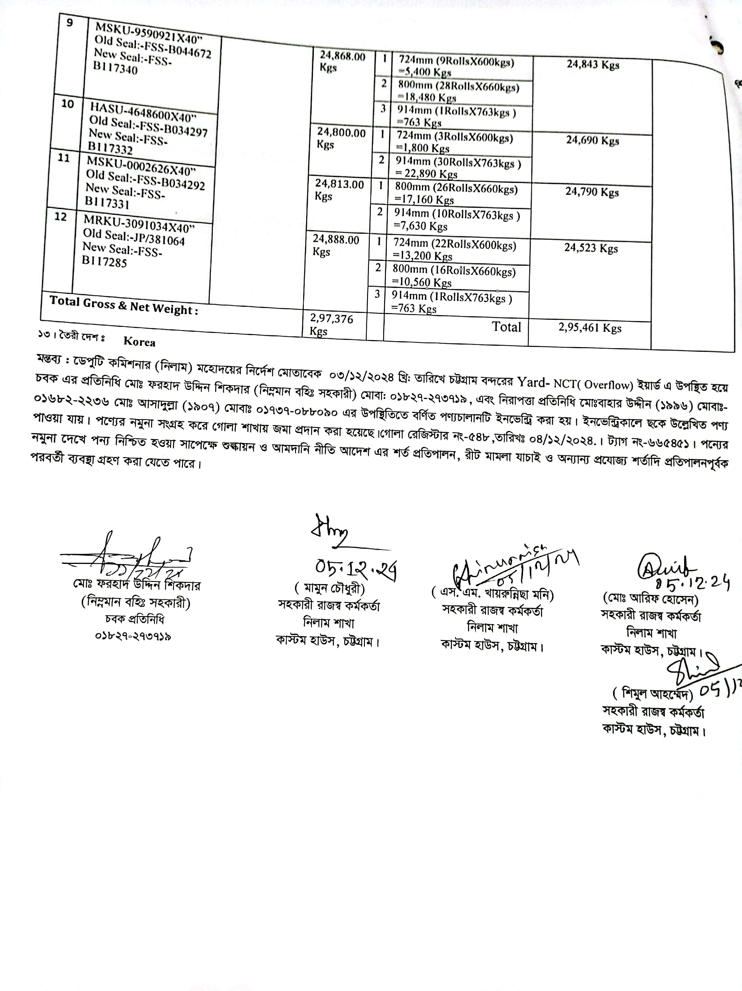 Terms & condition : নিলাম বিজ্ঞপ্তিতে উল্লিখিত সময়ের মধ্যে সেখানে সে অবস্থায় আছে, সে অবস্থায় সরেজমিন পণ্য পরিদর্শন করে নিলামে অংশগ্রহণ করার জন্য আগ্রহী নিলাম ক্রেতাগণকে অনুরোধ করা যাচ্ছে। দরপত্র উন্মুক্ত করার পর নিলামে অংশগ্রহণকারী/বিডার কর্তৃক পণ্য সংক্রান্ত কোন আপত্তি/আবেদন গ্রহণযোগ্য হবে না। আমদানি নীতি আদেশ ২০২১-২০২৪, বিদ্যমান অন্যান্য আইন ও বিধি-বিধানের প্রযোজ্য সকল শর্ত যথাযথ পরিপালনপূর্বক, প্রযোজ্য ক্ষেত্রে রাসায়নিক পরীক্ষার মাধ্যমে নিলামে বিক্রয়যোগ্য পণ্যের সঠিকতা যাচাই ও ব্যবহার উপযোগিতা থাকা সাপেক্ষে এবং খালাসকালে পণ্যের বর্ণনা এবং ওজন নিশ্চিত করে পণ্য ছাড়যোগ্য হবে। কোনরূপ কারণ দর্শানো ব্যতিরেকে কর্তৃপক্ষ যে কোন সময় ও পর্যায়ে যে কোন লট বা সকল লটের নিলাম আংশিক বা সম্পূর্ণ স্থগিত বা বাতিল করার অধিকার সংরক্ষণ করেন।
