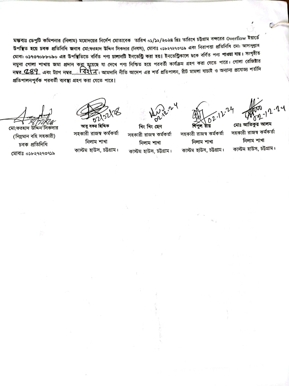 Terms & condition : নিলাম বিজ্ঞপ্তিতে উল্লিখিত সময়ের মধ্যে সেখানে সে অবস্থায় আছে, সে অবস্থায় সরেজমিন পণ্য পরিদর্শন করে নিলামে অংশগ্রহণ করার জন্য আগ্রহী নিলাম ক্রেতাগণকে অনুরোধ করা যাচ্ছে। দরপত্র উন্মুক্ত করার পর নিলামে অংশগ্রহণকারী/বিডার কর্তৃক পণ্য সংক্রান্ত কোন আপত্তি/আবেদন গ্রহণযোগ্য হবে না। আমদানি নীতি আদেশ ২০২১-২০২৪, বিদ্যমান অন্যান্য আইন ও বিধি-বিধানের প্রযোজ্য সকল শর্ত যথাযথ পরিপালনপূর্বক, প্রযোজ্য ক্ষেত্রে রাসায়নিক পরীক্ষার মাধ্যমে নিলামে বিক্রয়যোগ্য পণ্যের সঠিকতা যাচাই ও ব্যবহার উপযোগিতা থাকা সাপেক্ষে এবং খালাসকালে পণ্যের বর্ণনা এবং ওজন নিশ্চিত করে পণ্য ছাড়যোগ্য হবে। কোনরূপ কারণ দর্শানো ব্যতিরেকে কর্তৃপক্ষ যে কোন সময় ও পর্যায়ে যে কোন লট বা সকল লটের নিলাম আংশিক বা সম্পূর্ণ স্থগিত বা বাতিল করার অধিকার সংরক্ষণ করেন।