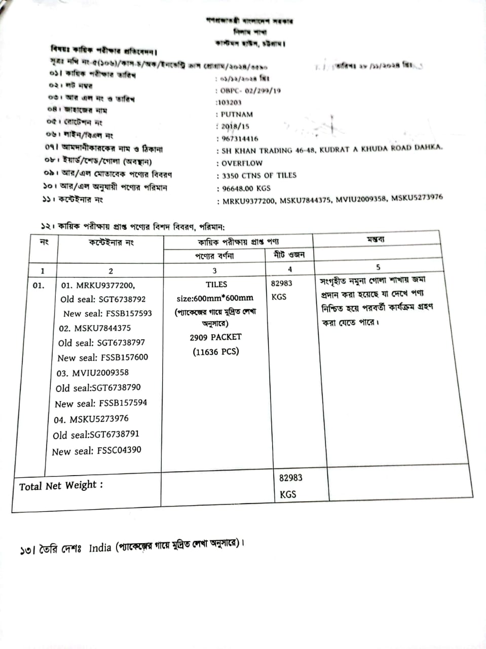 | কন্টেনার/জি আর নং |