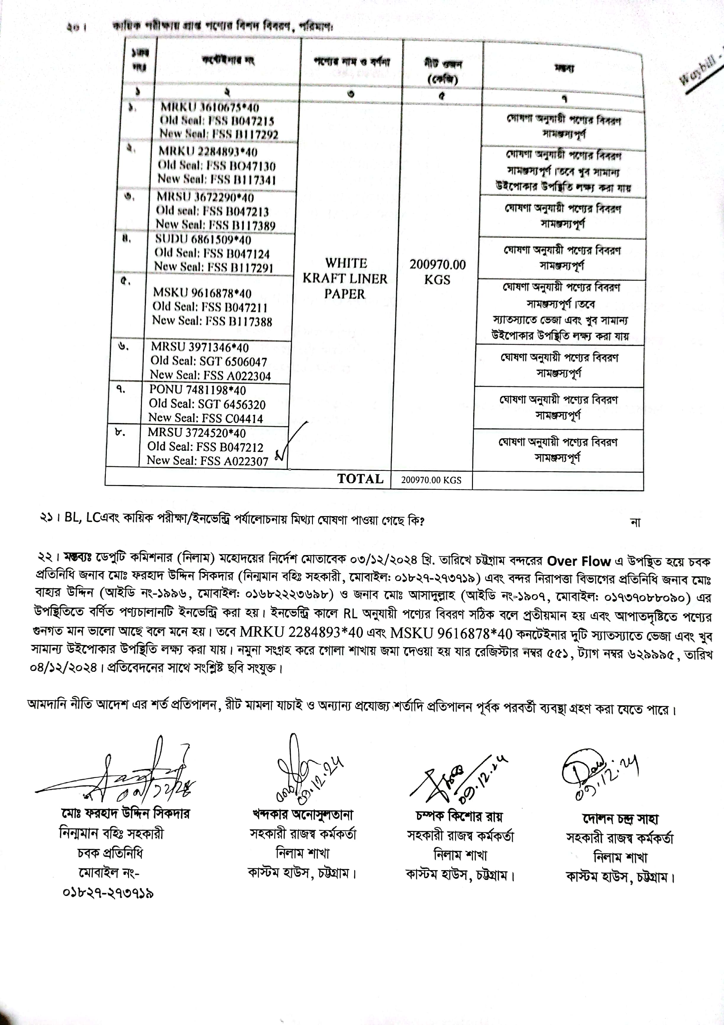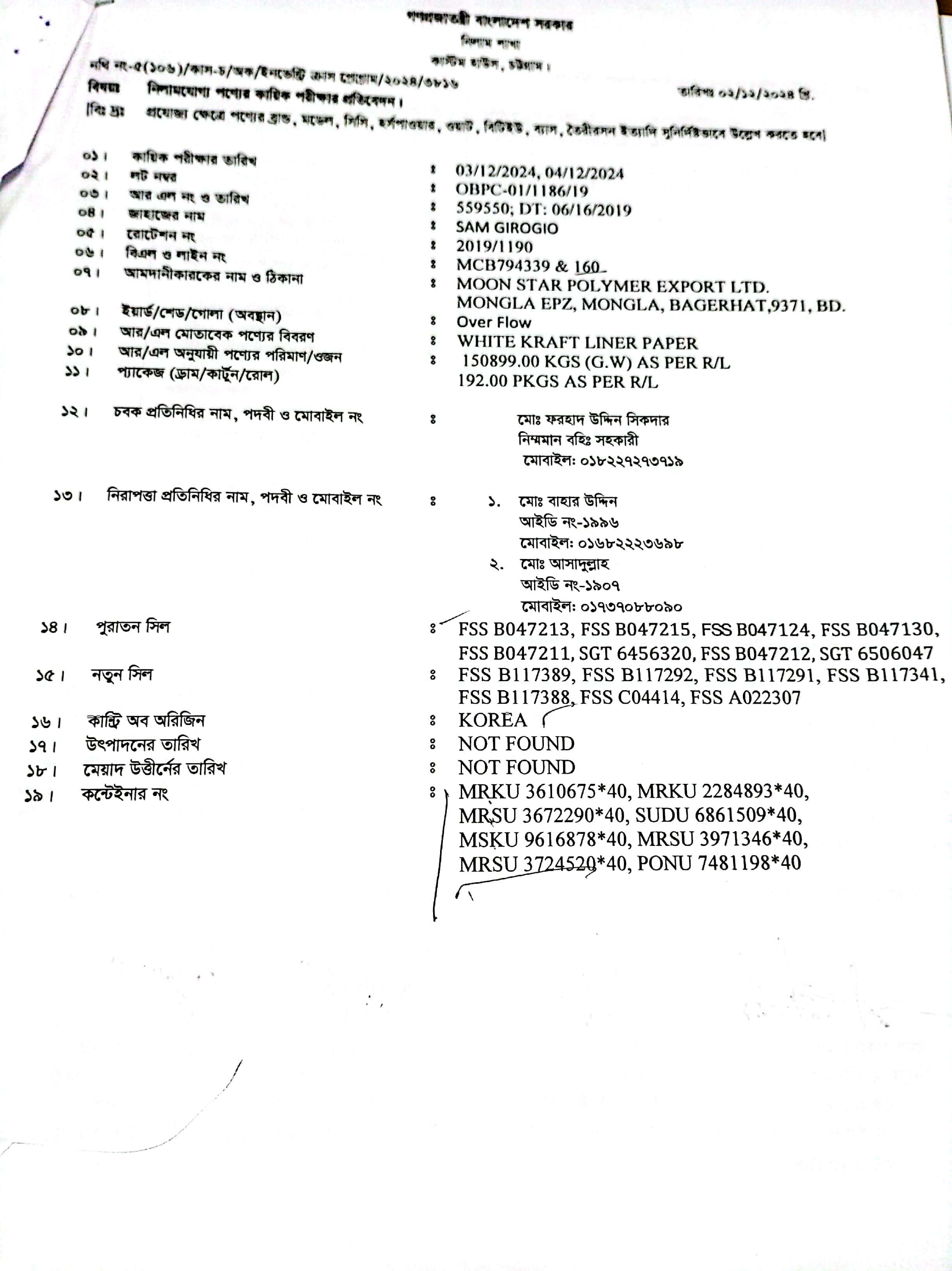 Terms & condition : নিলাম বিজ্ঞপ্তিতে উল্লিখিত সময়ের মধ্যে সেখানে সে অবস্থায় আছে, সে অবস্থায় সরেজমিন পণ্য পরিদর্শন করে নিলামে অংশগ্রহণ করার জন্য আগ্রহী নিলাম ক্রেতাগণকে অনুরোধ করা যাচ্ছে। দরপত্র উন্মুক্ত করার পর নিলামে অংশগ্রহণকারী/বিডার কর্তৃক পণ্য সংক্রান্ত কোন আপত্তি/আবেদন গ্রহণযোগ্য হবে না। আমদানি নীতি আদেশ ২০২১-২০২৪, বিদ্যমান অন্যান্য আইন ও বিধি-বিধানের প্রযোজ্য সকল শর্ত যথাযথ পরিপালনপূর্বক, প্রযোজ্য ক্ষেত্রে রাসায়নিক পরীক্ষার মাধ্যমে নিলামে বিক্রয়যোগ্য পণ্যের সঠিকতা যাচাই ও ব্যবহার উপযোগিতা থাকা সাপেক্ষে এবং খালাসকালে পণ্যের বর্ণনা এবং ওজন নিশ্চিত করে পণ্য ছাড়যোগ্য হবে। কোনরূপ কারণ দর্শানো ব্যতিরেকে কর্তৃপক্ষ যে কোন সময় ও পর্যায়ে যে কোন লট বা সকল লটের নিলাম আংশিক বা সম্পূর্ণ স্থগিত বা বাতিল করার অধিকার সংরক্ষণ করেন।