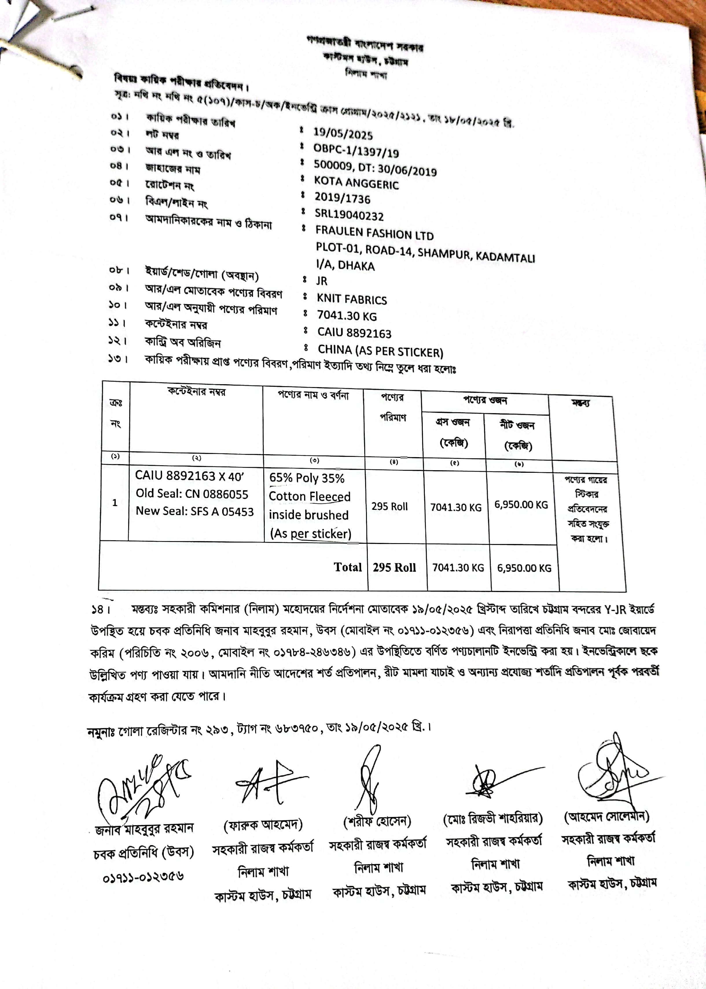 | কন্টেনার/জি আর নং |