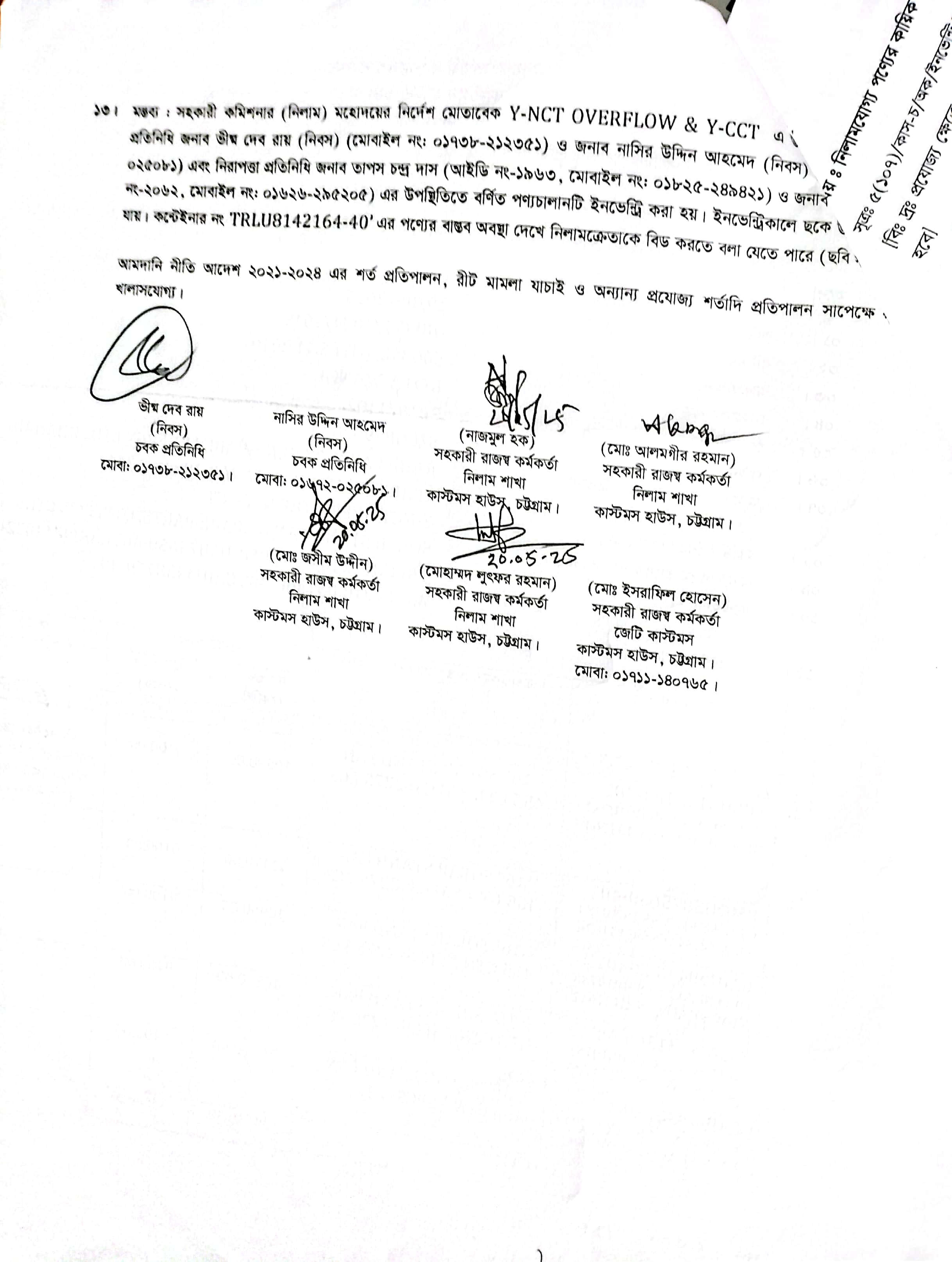 Terms & condition : নিলাম বিজ্ঞপ্তিতে উল্লিখিত সময়ের মধ্যে সেখানে সে অবস্থায় আছে, সে অবস্থায় সরেজমিন পণ্য পরিদর্শন করে নিলামে অংশগ্রহণ করার জন্য আগ্রহী নিলাম ক্রেতাগণকে অনুরোধ করা যাচ্ছে। দরপত্র উন্মুক্ত করার পর নিলামে অংশগ্রহণকারী/বিডার কর্তৃক পণ্য সংক্রান্ত কোন আপত্তি/আবেদন গ্রহণযোগ্য হবে না। আমদানি নীতি আদেশ ২০২১-২০২৪, বিদ্যমান অন্যান্য আইন ও বিধি-বিধানের প্রযোজ্য সকল শর্ত যথাযথ পরিপালনপূর্বক, প্রযোজ্য ক্ষেত্রে রাসায়নিক পরীক্ষার মাধ্যমে নিলামে বিক্রয়যোগ্য পণ্যের সঠিকতা যাচাই ও ব্যবহার উপযোগিতা থাকা সাপেক্ষে এবং খালাসকালে পণ্যের বর্ণনা এবং ওজন নিশ্চিত করে পণ্য ছাড়যোগ্য হবে। কোনরূপ কারণ দর্শানো ব্যতিরেকে কর্তৃপক্ষ যে কোন সময় ও পর্যায়ে যে কোন লট বা সকল লটের নিলাম আংশিক বা সম্পূর্ণ স্থগিত বা বাতিল করার অধিকার সংরক্ষণ করেন।