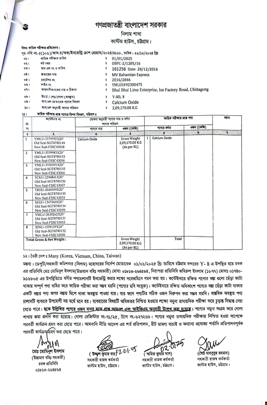 Calcium Oxide, Gross Weight: 209170 Kg (As per RL) |