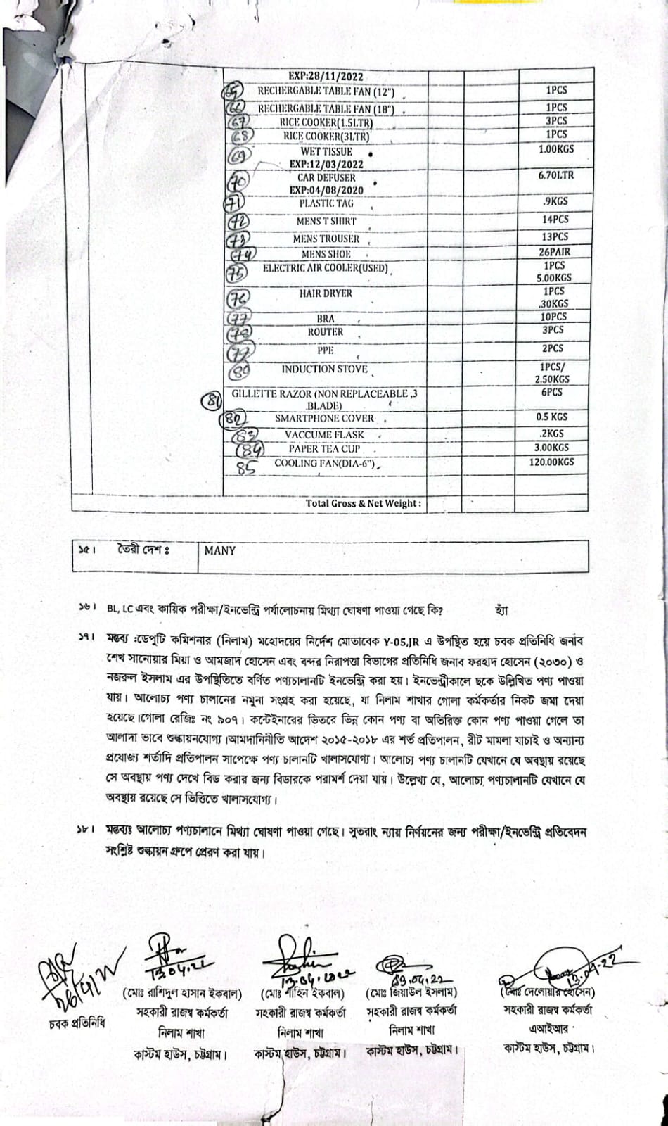 Terms & condition : নিলাম বিজ্ঞপ্তিতে উল্লিখিত সময়ের মধ্যে সেখানে সে অবস্থায় আছে, সে অবস্থায় সরেজমিন পণ্য পরিদর্শন করে নিলামে অংশগ্রহণ করার জন্য আগ্রহী নিলাম ক্রেতাগণকে অনুরোধ করা যাচ্ছে। দরপত্র উন্মুক্ত করার পর নিলামে অংশগ্রহণকারী/বিডার কর্তৃক পণ্য সংক্রান্ত কোন আপত্তি/আবেদন গ্রহণযোগ্য হবে না। আমদানি নীতি আদেশ ২০২১-২০২৪, বিদ্যমান অন্যান্য আইন ও বিধি-বিধানের প্রযোজ্য সকল শর্ত যথাযথ পরিপালনপূর্বক, প্রযোজ্য ক্ষেত্রে রাসায়নিক পরীক্ষার মাধ্যমে নিলামে বিক্রয়যোগ্য পণ্যের সঠিকতা যাচাই ও ব্যবহার উপযোগিতা থাকা সাপেক্ষে এবং খালাসকালে পণ্যের বর্ণনা এবং ওজন নিশ্চিত করে পণ্য ছাড়যোগ্য হবে। কোনরূপ কারণ দর্শানো ব্যতিরেকে কর্তৃপক্ষ যে কোন সময় ও পর্যায়ে যে কোন লট বা সকল লটের নিলাম আংশিক বা সম্পূর্ণ স্থগিত বা বাতিল করার অধিকার সংরক্ষণ করেন।