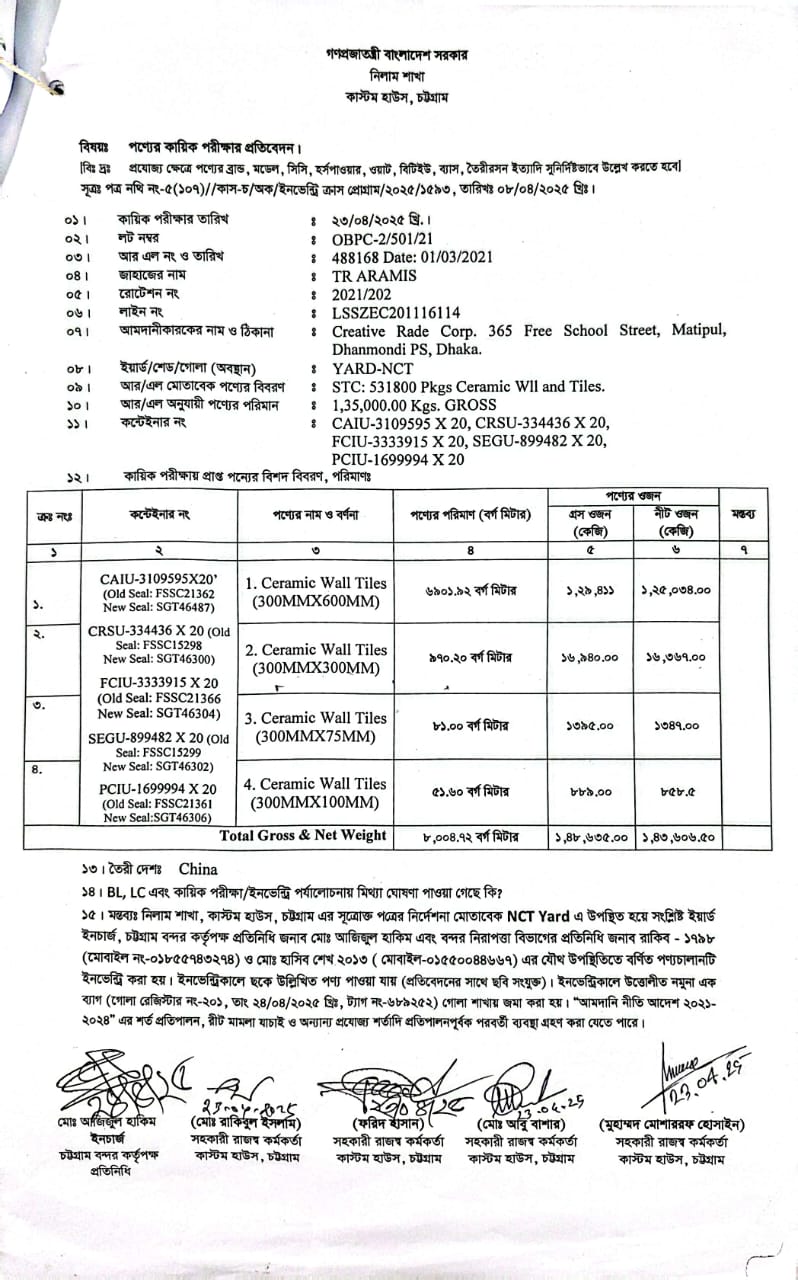 Terms & condition : নিলাম বিজ্ঞপ্তিতে উল্লিখিত সময়ের মধ্যে সেখানে সে অবস্থায় আছে, সে অবস্থায় সরেজমিন পণ্য পরিদর্শন করে নিলামে অংশগ্রহণ করার জন্য আগ্রহী নিলাম ক্রেতাগণকে অনুরোধ করা যাচ্ছে। দরপত্র উন্মুক্ত করার পর নিলামে অংশগ্রহণকারী/বিডার কর্তৃক পণ্য সংক্রান্ত কোন আপত্তি/আবেদন গ্রহণযোগ্য হবে না। আমদানি নীতি আদেশ ২০২১-২০২৪, বিদ্যমান অন্যান্য আইন ও বিধি-বিধানের প্রযোজ্য সকল শর্ত যথাযথ পরিপালনপূর্বক, প্রযোজ্য ক্ষেত্রে রাসায়নিক পরীক্ষার মাধ্যমে নিলামে বিক্রয়যোগ্য পণ্যের সঠিকতা যাচাই ও ব্যবহার উপযোগিতা থাকা সাপেক্ষে এবং খালাসকালে পণ্যের বর্ণনা এবং ওজন নিশ্চিত করে পণ্য ছাড়যোগ্য হবে। কোনরূপ কারণ দর্শানো ব্যতিরেকে কর্তৃপক্ষ যে কোন সময় ও পর্যায়ে যে কোন লট বা সকল লটের নিলাম আংশিক বা সম্পূর্ণ স্থগিত বা বাতিল করার অধিকার সংরক্ষণ করেন।