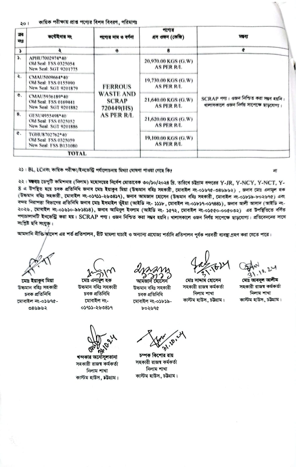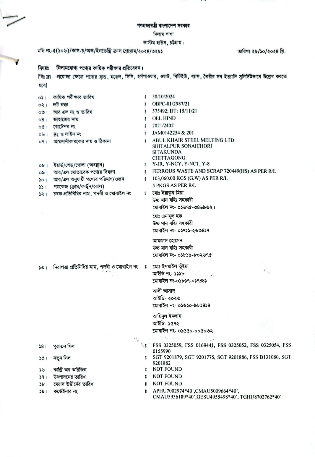 Terms & condition : আমদানি নীতি আদেশ এবং বিদ্যমান অন্যান্য আইন ও বিধি-বিধানের প্রযোজ্য সকল শর্ত পরিপালন এবং প্রযোজ্য ক্ষেত্রে রাসায়নিক পরীক্ষায় পণ্যের সঠিকতা ও ব্যবহার উপযোগিতা থাকা সাপেক্ষে খালাসকালে পণ্যের বর্ণনা এবং ওজন নিশ্চিত করে পণ্য ছাড়যোগ্য হবে। কোন লটভুক্ত পণ্যচালানে মেয়াদ উত্তীর্ণ/ধ্বসংযোগ্য পণ্য অন্তর্ভুক্ত থাকলে, উক্ত পণ্যচালানের ক্ষেত্রে মেয়াদ উত্তীর্ণ/ধ্বসংযোগ্য পণ্য ব্যতীত (প্রযোজ্য ক্ষেত্রে) কেবল মেয়াদযুক্ত/নিলামযোগ্য পণ্যসমূহ বিদ্যমান ও প্রযোজ্য আইন ও বিধি-বিধানের প্রযোজ্য সকল শর্ত পরিপালন সাপেক্ষে পণ্য ছাড়যোগ্য হবে। সার্ভার জটিলতা এড়ানোর জন্য আগ্রহী নিলাম ক্রেতাগণকে সরেজমিন পণ্য দেখে নিলামের নির্ধারিত শেষ তারিখ ও সময়ের (২৭/১১/২০২৫ খ্রি. তারিখ বিকাল ০৪.০০ টা) পূর্বেই বিশেষ ই-নিলামে অংশগ্রহণ করার জন্য অনুরোধ করা যাচ্ছে। কোনরূপ কারণ দর্শানো ব্যতিরেকে কর্তৃপক্ষ যে কোন সময় ও পর্যায়ে যে কোন লট বা সকল লটের নিলাম আংশিক বা সম্পূর্ণ স্থগিত বা বাতিলের অধিকার সংরক্ষণ করেন।