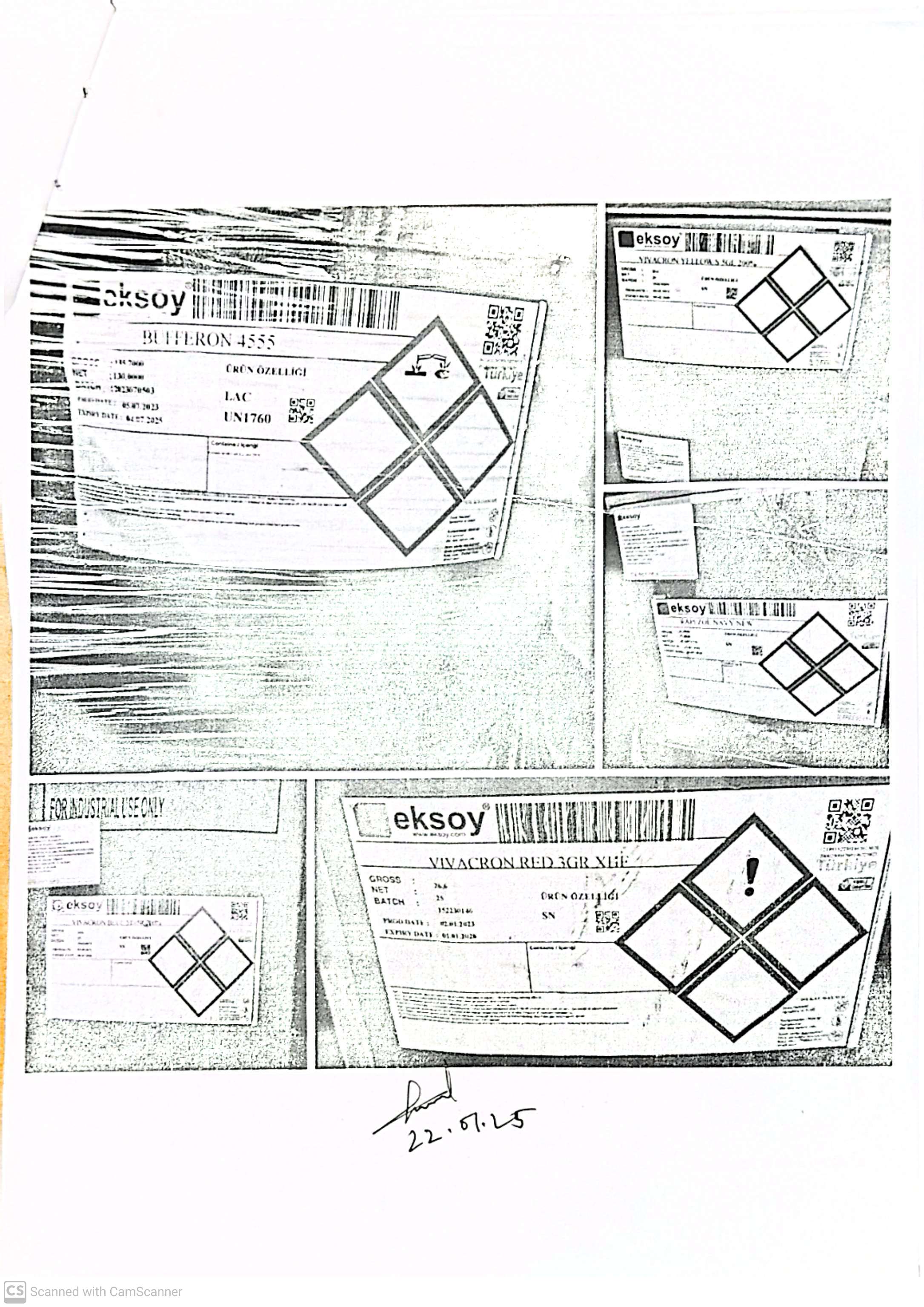 (1) Disperse Dyes Yellow Color, Exp Date: 02.02.2028= 650 Kg (2) Disperse Dyes Navy Color, Exp Date: 15.07.2028= 625 Kg (3) Disperse Dyes Red Color, Exp Date: 01.01.2028= 650 Kg (4) Disperse Dyes Blue Color, Exp Date: 30.05.2028= 625 Kg (Inventory Report Attached) |