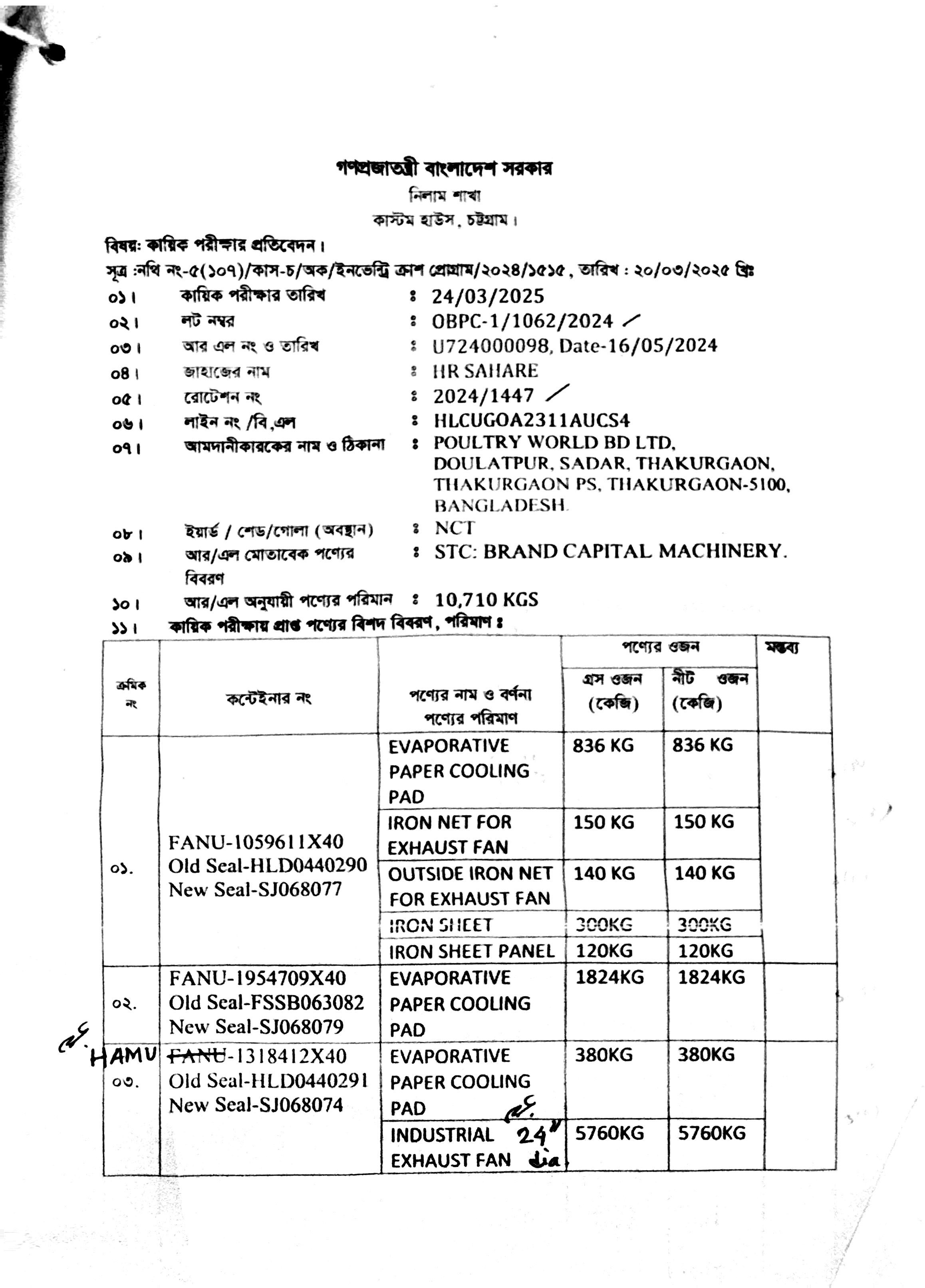 লটের শিরোনাম :(1) Evaporative Paper Cooling Pad: 3,040.00 (2) Iron Net for Exhaust Fan: 150.00 (3) Outside Iron Net for Exhaust Fan: 140.00 (4) Industrial Exhaust Fan: 5,760.00 (5) Iron Sheet: 300.00 (6) Iron Sheet(Previous Bid: 0 TK)