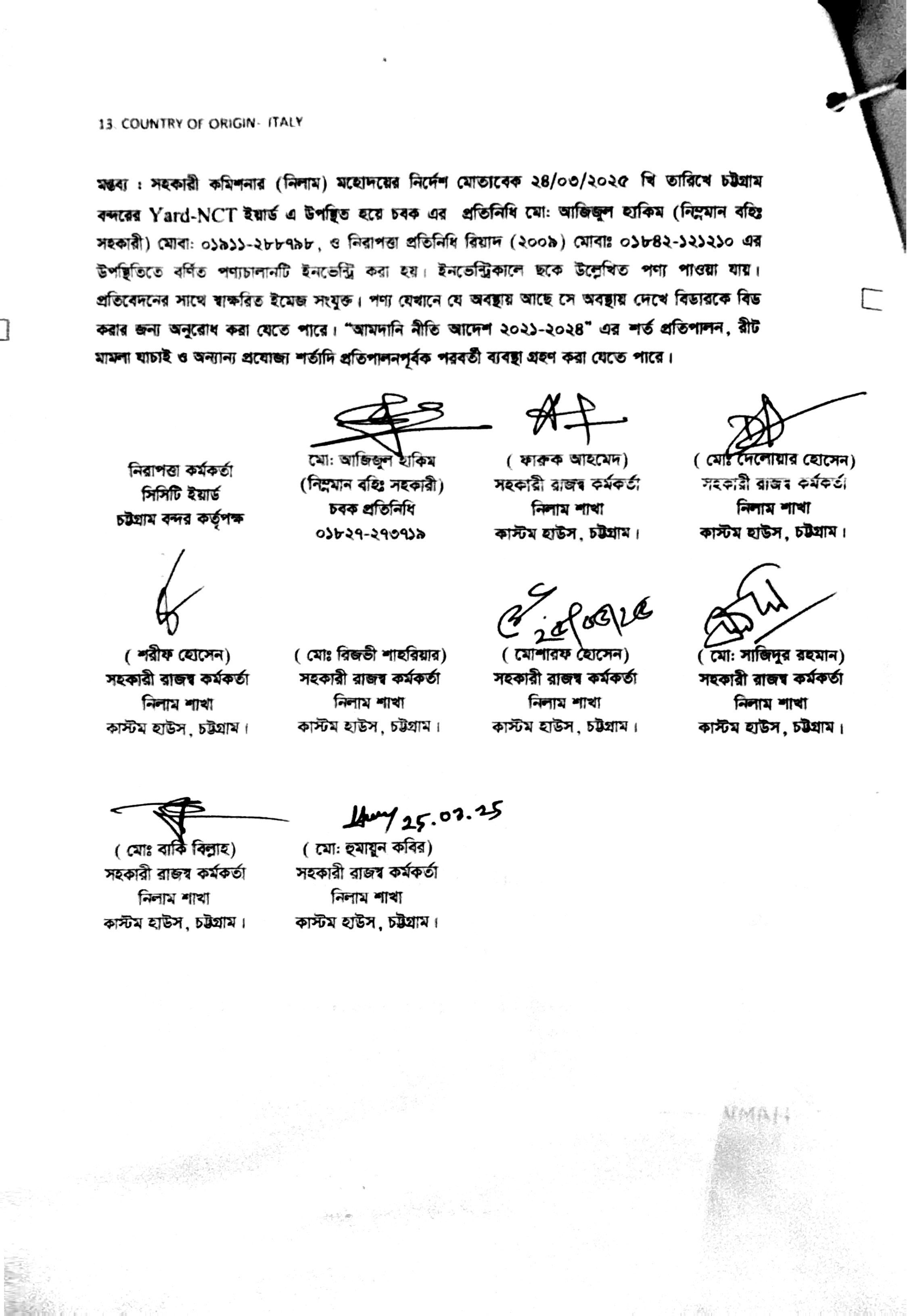 Terms & condition : আমদানি নীতি আদেশ এবং বিদ্যমান অন্যান্য আইন ও বিধি-বিধানের প্রযোজ্য সকল শর্ত পরিপালন সাপেক্ষে পণ্য ছাড়যোগ্য হবে। প্রযোজ্য ক্ষেত্রে রাসায়নিক পরীক্ষায় পণ্যের সঠিকতা ও ব্যবহার উপযোগিতা থাকা সাপেক্ষে পণ্য ছাড়যোগ্য হবে। যে সকল লটভুক্ত পণ্যচালানে মেয়াদ উত্তীর্ণ/ধ্বসংযোগ্য পণ্য অন্তর্ভুক্ত রয়েছে, সে সকল পণ্যচালানের ক্ষেত্রে মেয়াদ উত্তীর্ণ/ধ্বসংযোগ্য পণ্য ব্যতীত (প্রযোজ্য ক্ষেত্রে) কেবল মেয়াদযুক্ত/নিলামযোগ্য পণ্যসমূহ বিদ্যমান ও প্রযোজ্য সকল আইন ও বিধি-বিধানের প্রযোজ্য সকল শর্ত পরিপালন সাপেক্ষে পণ্য ছাড়যোগ্য হবে। কোনরূপ কারণ দর্শানো ব্যতিরেকে কর্তৃপক্ষ যে কোন সময় ও পর্যায়ে যে কোন লট বা সকল লটের নিলাম আংশিক বা সম্পূর্ণ স্থগিত বা বাতিল করার অধিকার সংরক্ষণ করেন।
