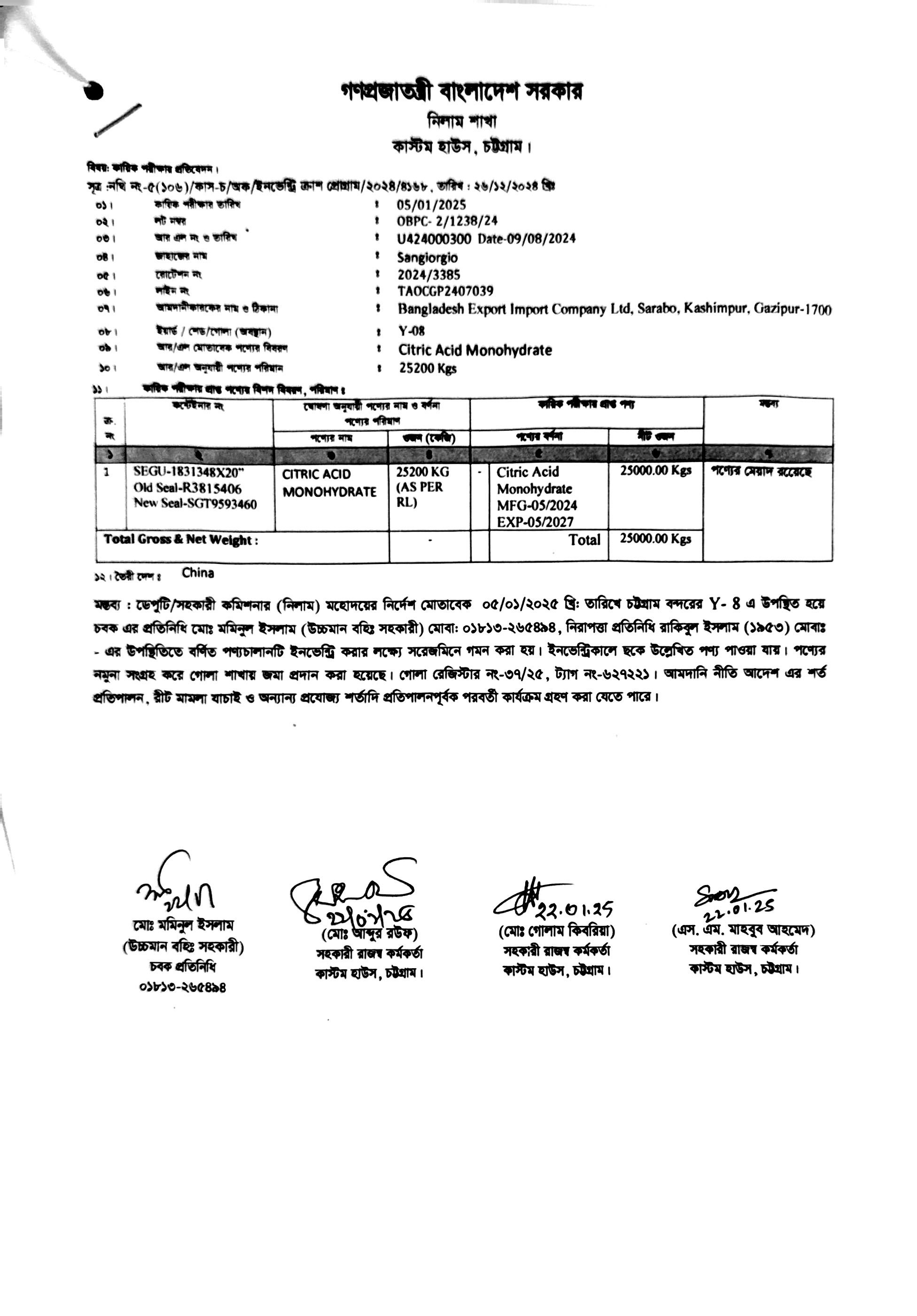 লটের শিরোনাম :Citric Acid Monohydrate (Expire date: 05/2027)(Previous Bid: 0 TK)