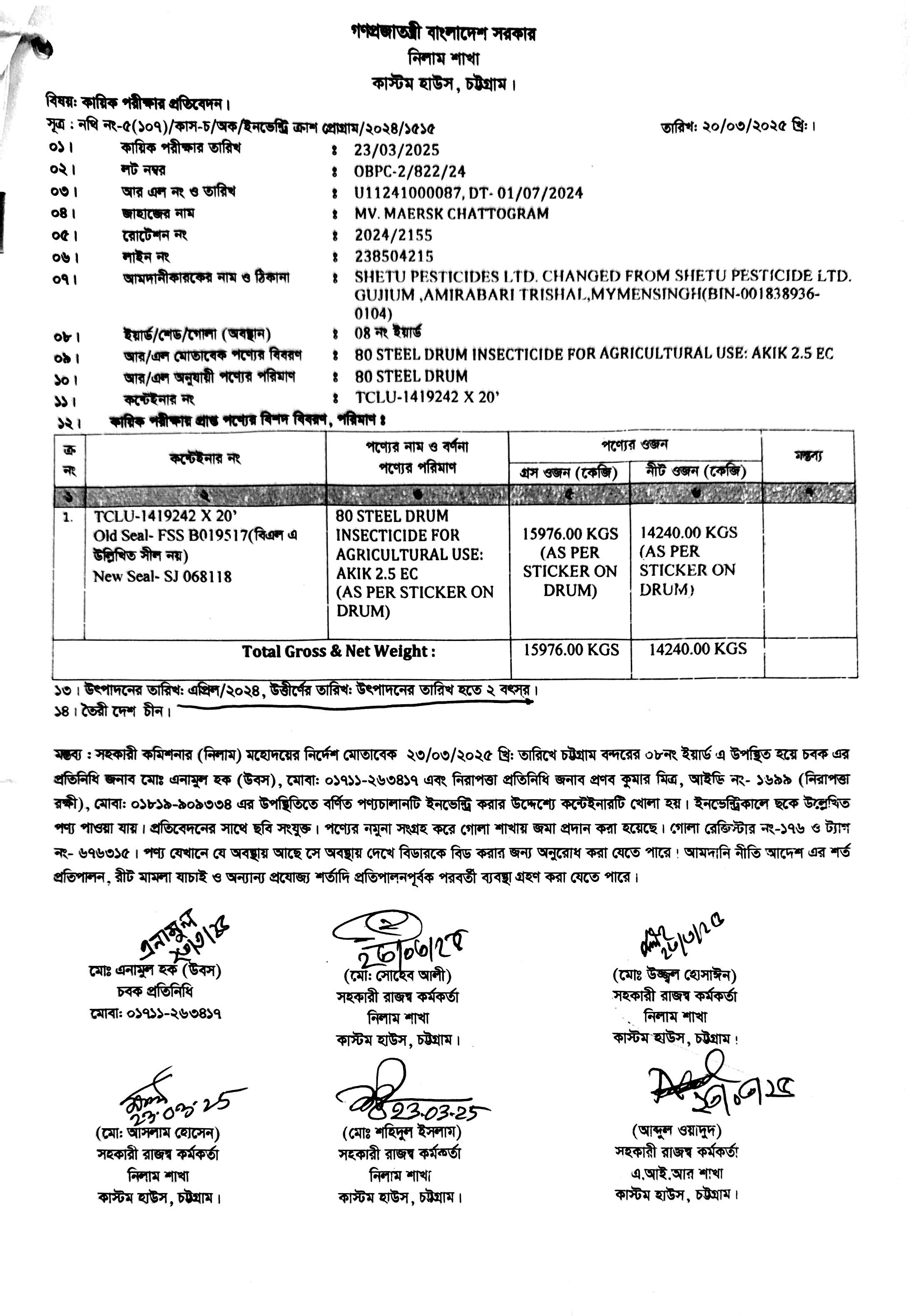 Terms & condition : আমদানি নীতি আদেশ এবং বিদ্যমান অন্যান্য আইন ও বিধি-বিধানের প্রযোজ্য সকল শর্ত পরিপালন সাপেক্ষে পণ্য ছাড়যোগ্য হবে। প্রযোজ্য ক্ষেত্রে রাসায়নিক পরীক্ষায় পণ্যের সঠিকতা ও ব্যবহার উপযোগিতা থাকা সাপেক্ষে পণ্য ছাড়যোগ্য হবে। যে সকল লটভুক্ত পণ্যচালানে মেয়াদ উত্তীর্ণ/ধ্বসংযোগ্য পণ্য অন্তর্ভুক্ত রয়েছে, সে সকল পণ্যচালানের ক্ষেত্রে মেয়াদ উত্তীর্ণ/ধ্বসংযোগ্য পণ্য ব্যতীত (প্রযোজ্য ক্ষেত্রে) কেবল মেয়াদযুক্ত/নিলামযোগ্য পণ্যসমূহ বিদ্যমান ও প্রযোজ্য সকল আইন ও বিধি-বিধানের প্রযোজ্য সকল শর্ত পরিপালন সাপেক্ষে পণ্য ছাড়যোগ্য হবে। কোনরূপ কারণ দর্শানো ব্যতিরেকে কর্তৃপক্ষ যে কোন সময় ও পর্যায়ে যে কোন লট বা সকল লটের নিলাম আংশিক বা সম্পূর্ণ স্থগিত বা বাতিল করার অধিকার সংরক্ষণ করেন।
