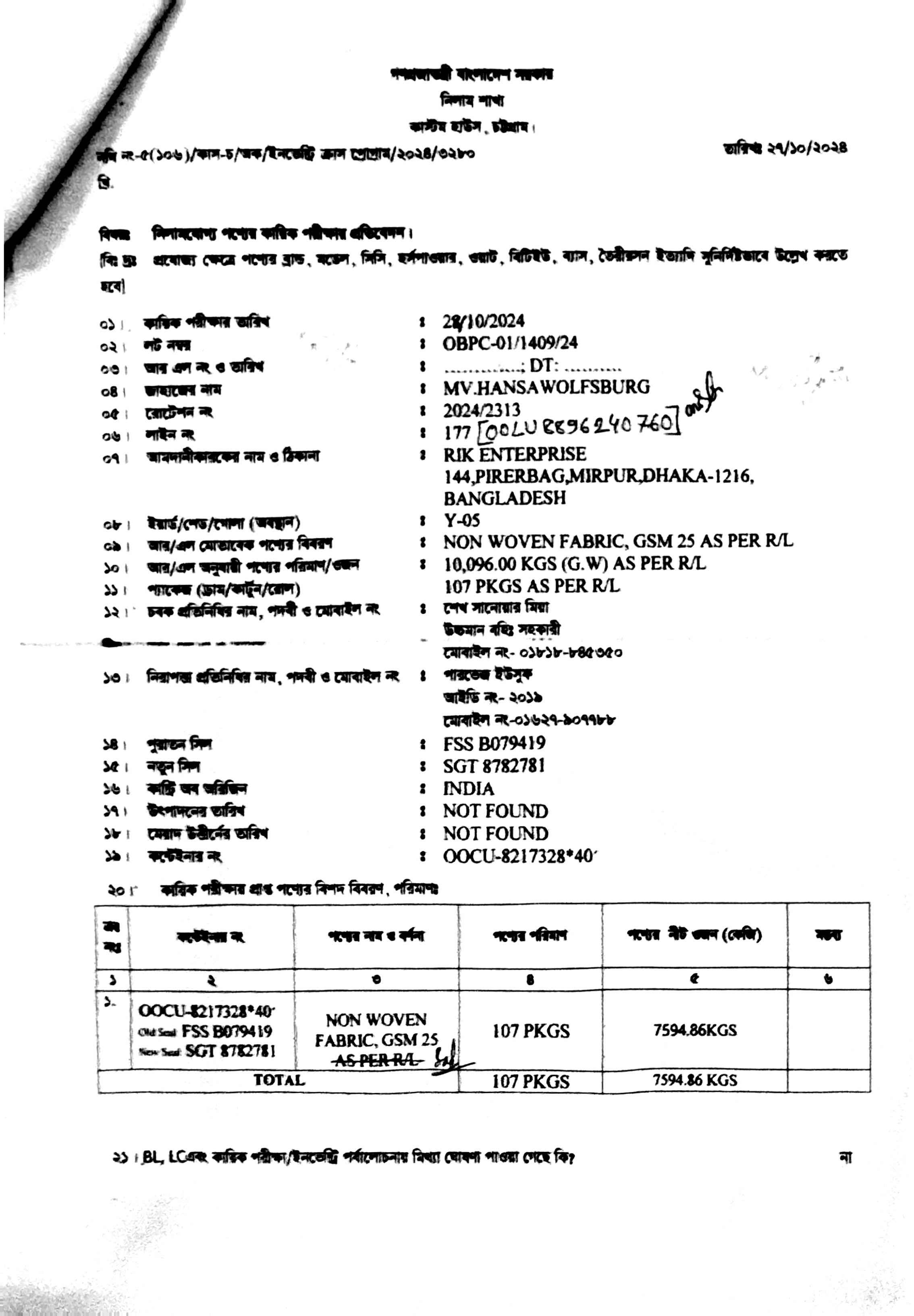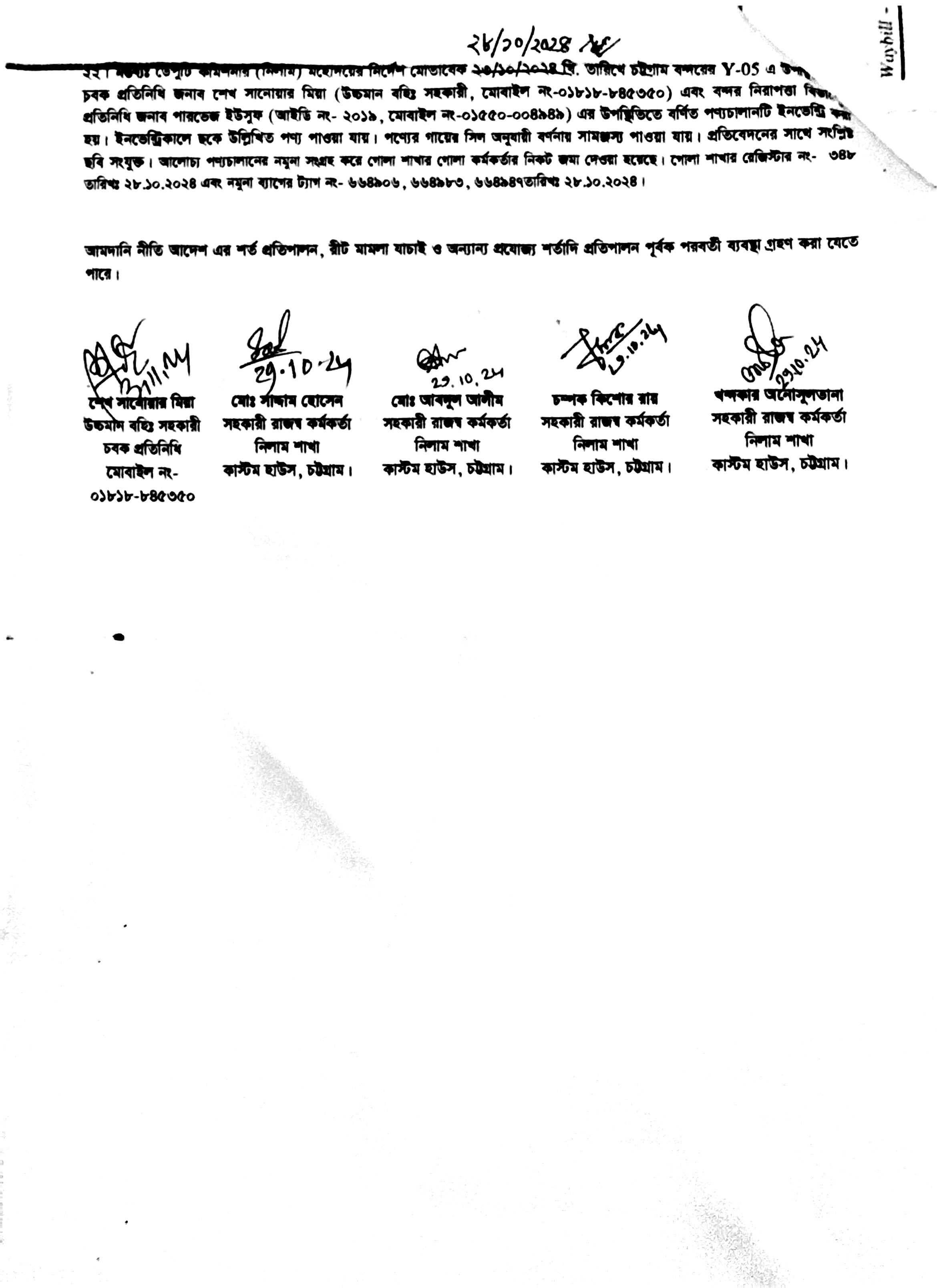 Terms & condition : আমদানি নীতি আদেশ এবং বিদ্যমান অন্যান্য আইন ও বিধি-বিধানের প্রযোজ্য সকল শর্ত পরিপালন সাপেক্ষে পণ্য ছাড়যোগ্য হবে। প্রযোজ্য ক্ষেত্রে রাসায়নিক পরীক্ষায় পণ্যের সঠিকতা ও ব্যবহার উপযোগিতা থাকা সাপেক্ষে পণ্য ছাড়যোগ্য হবে। যে সকল লটভুক্ত পণ্যচালানে মেয়াদ উত্তীর্ণ/ধ্বসংযোগ্য পণ্য অন্তর্ভুক্ত রয়েছে, সে সকল পণ্যচালানের ক্ষেত্রে মেয়াদ উত্তীর্ণ/ধ্বসংযোগ্য পণ্য ব্যতীত (প্রযোজ্য ক্ষেত্রে) কেবল মেয়াদযুক্ত/নিলামযোগ্য পণ্যসমূহ বিদ্যমান ও প্রযোজ্য সকল আইন ও বিধি-বিধানের প্রযোজ্য সকল শর্ত পরিপালন সাপেক্ষে পণ্য ছাড়যোগ্য হবে। কোনরূপ কারণ দর্শানো ব্যতিরেকে কর্তৃপক্ষ যে কোন সময় ও পর্যায়ে যে কোন লট বা সকল লটের নিলাম আংশিক বা সম্পূর্ণ স্থগিত বা বাতিল করার অধিকার সংরক্ষণ করেন।