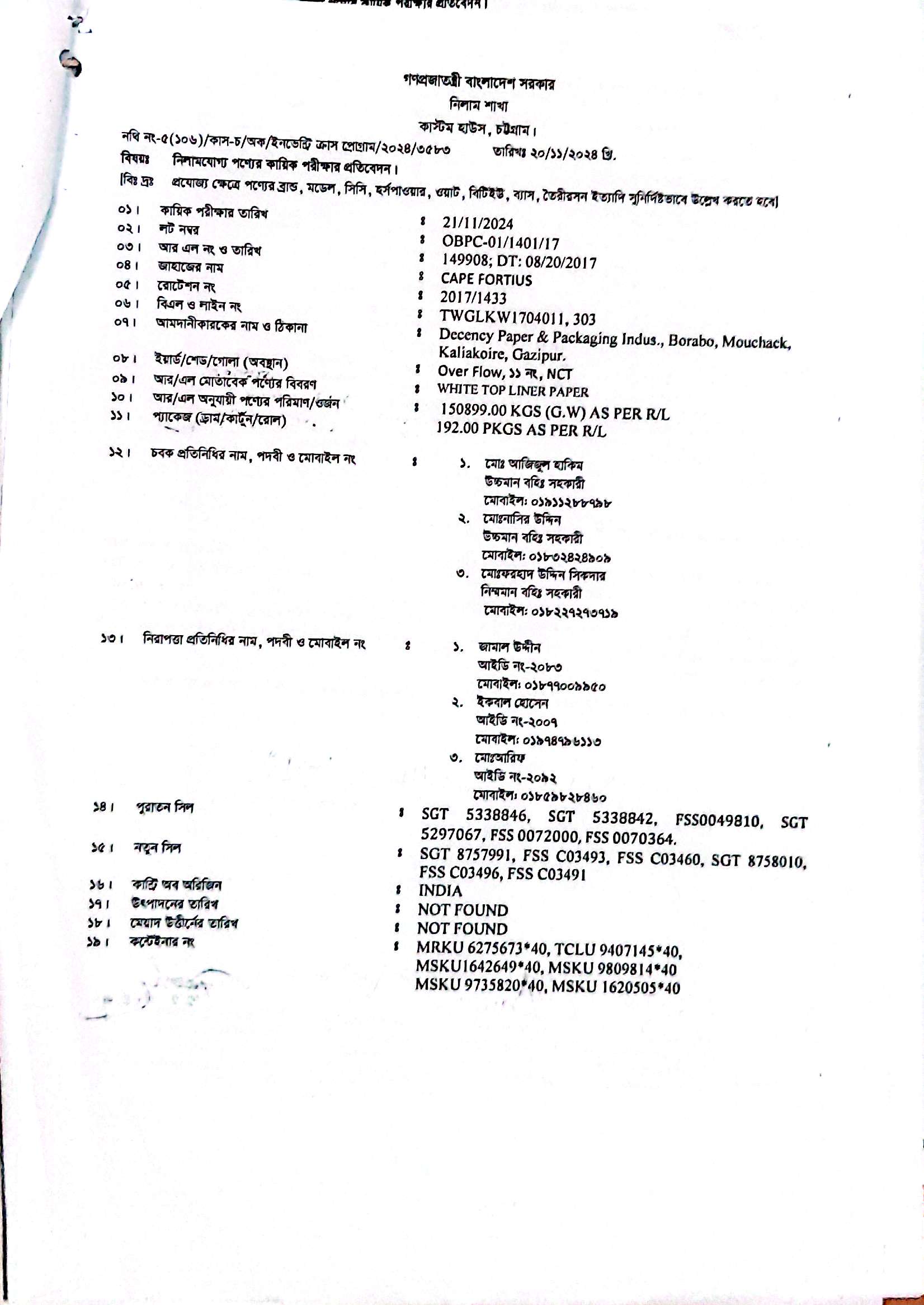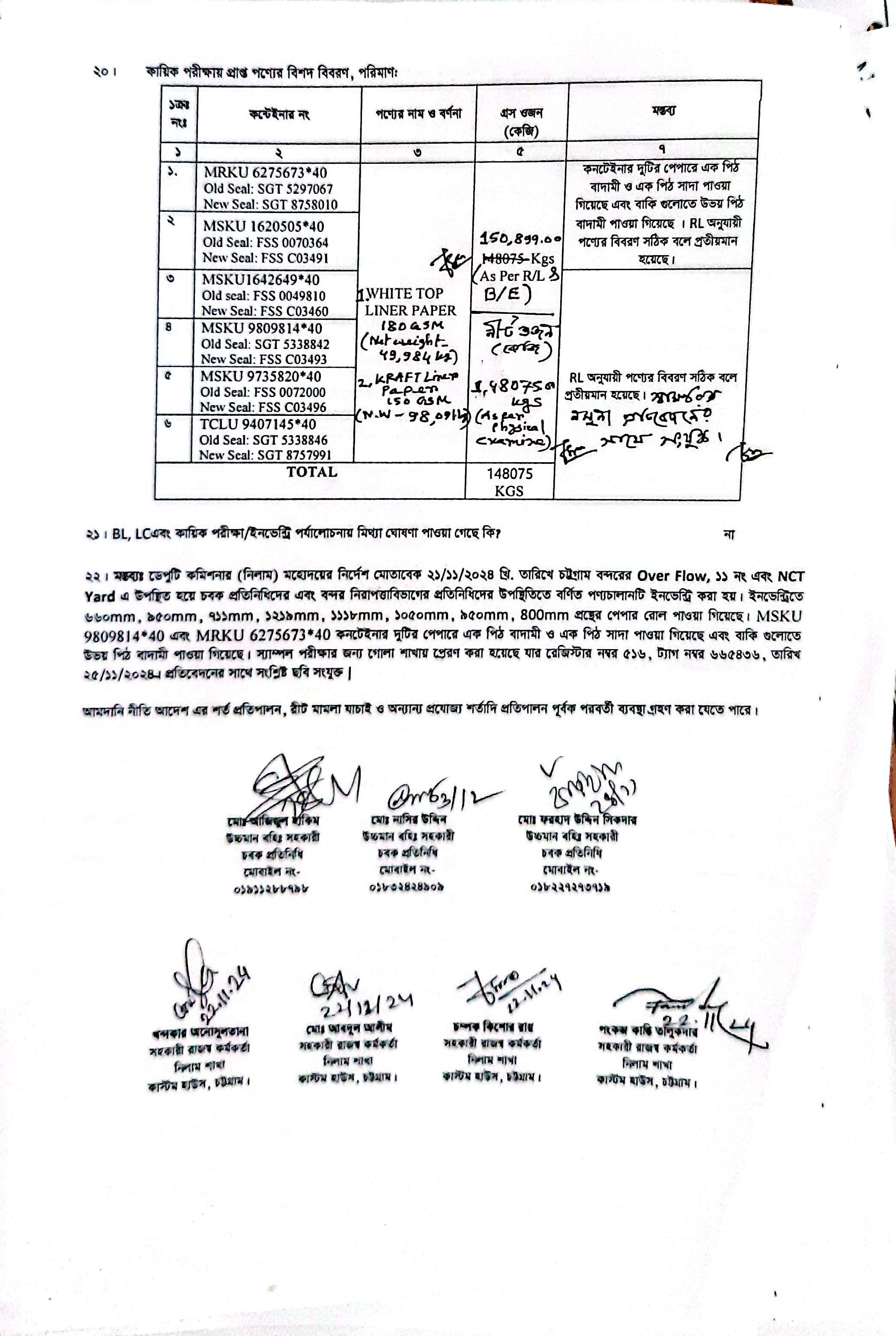 লটের শিরোনাম :1. White Top Liner Paper = 49984.00 Kg; 2. Kraft Liner Paper = 98091.00 Kg(Previous Bid: 0 TK)
