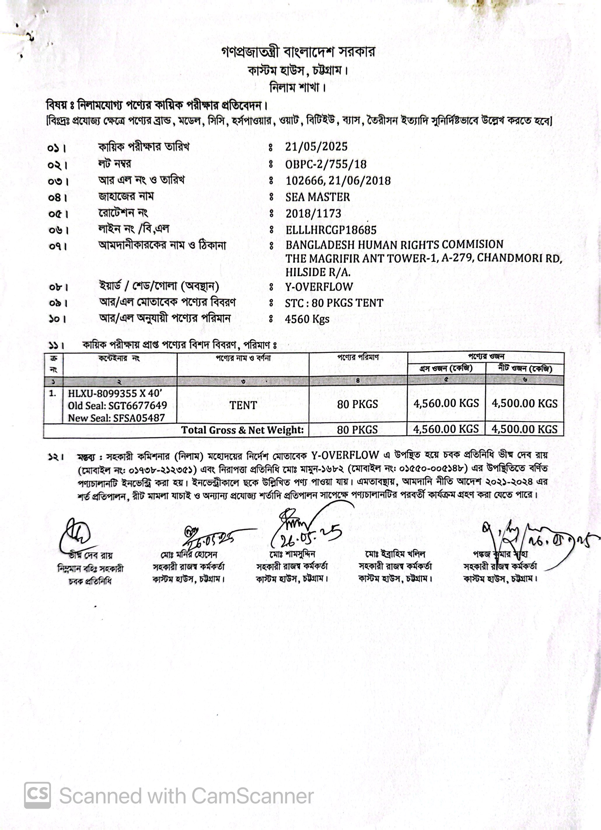 Terms & condition : আমদানি নীতি আদেশ এবং বিদ্যমান অন্যান্য আইন ও বিধি-বিধানের প্রযোজ্য সকল শর্ত পরিপালন এবং প্রযোজ্য ক্ষেত্রে রাসায়নিক পরীক্ষায় পণ্যের সঠিকতা ও ব্যবহার উপযোগিতা থাকা সাপেক্ষে পণ্য ছাড়যোগ্য হবে। যে সকল লটভুক্ত পণ্যচালানে মেয়াদ উত্তীর্ণ/ধ্বসংযোগ্য পণ্য অন্তর্ভুক্ত রয়েছে, সে সকল পণ্যচালানের ক্ষেত্রে মেয়াদ উত্তীর্ণ/ধ্বসংযোগ্য পণ্য ব্যতীত (প্রযোজ্য ক্ষেত্রে) কেবল মেয়াদযুক্ত/নিলামযোগ্য পণ্যসমূহ বিদ্যমান ও প্রযোজ্য সকল আইন ও বিধি-বিধানের প্রযোজ্য সকল শর্ত পরিপালন সাপেক্ষে পণ্য ছাড়যোগ্য হবে। সার্ভার জটিলতা এড়ানোর জন্য আগ্রহী নিলাম ক্রেতাগণকে সরেজমিন পণ্য দেখে নিলামের নির্ধারিত শেষ তারিখ ও সময়ের (৩০/০৯/২০২৫ খ্রি. তারিখ বিকাল ০৪.০০ টা) পূর্বেই বিশেষ ই-নিলামে অংশগ্রহণ করার জন্য অনুরোধ করা যাচ্ছে। কোনরূপ কারণ দর্শানো ব্যতিরেকে কর্তৃপক্ষ যে কোন সময় ও পর্যায়ে যে কোন লট বা সকল লটের নিলাম আংশিক বা সম্পূর্ণ স্থগিত বা বাতিল করার অধিকার সংরক্ষণ করেন।