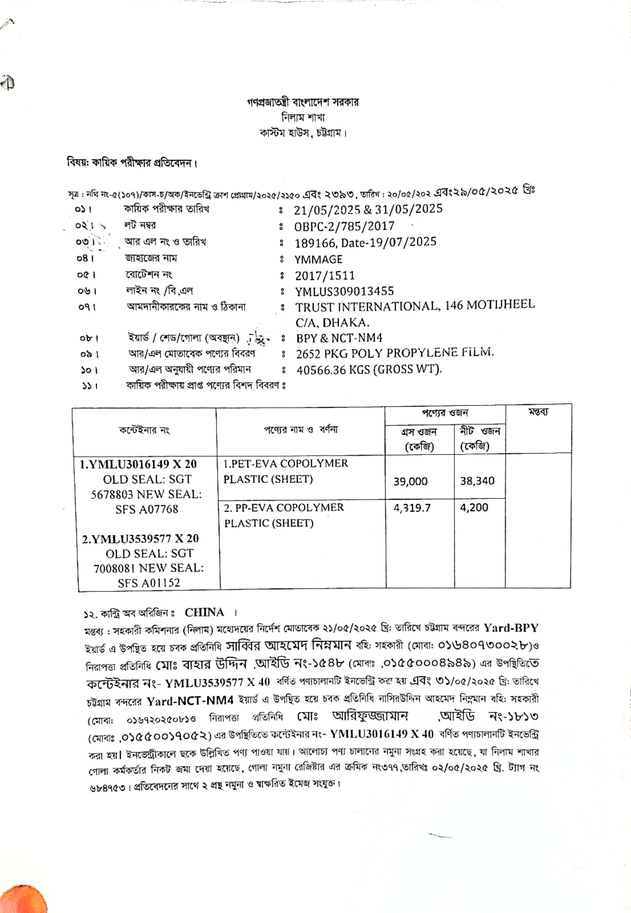 লটের শিরোনাম :(1) PET-EVA Copolymer Plastic (Sheet): 38,340.00 Kg; (2) PP-EVA Copolymer Plastic (Sheet): 4,200.00 Kg(Previous Bid: 0 TK)
