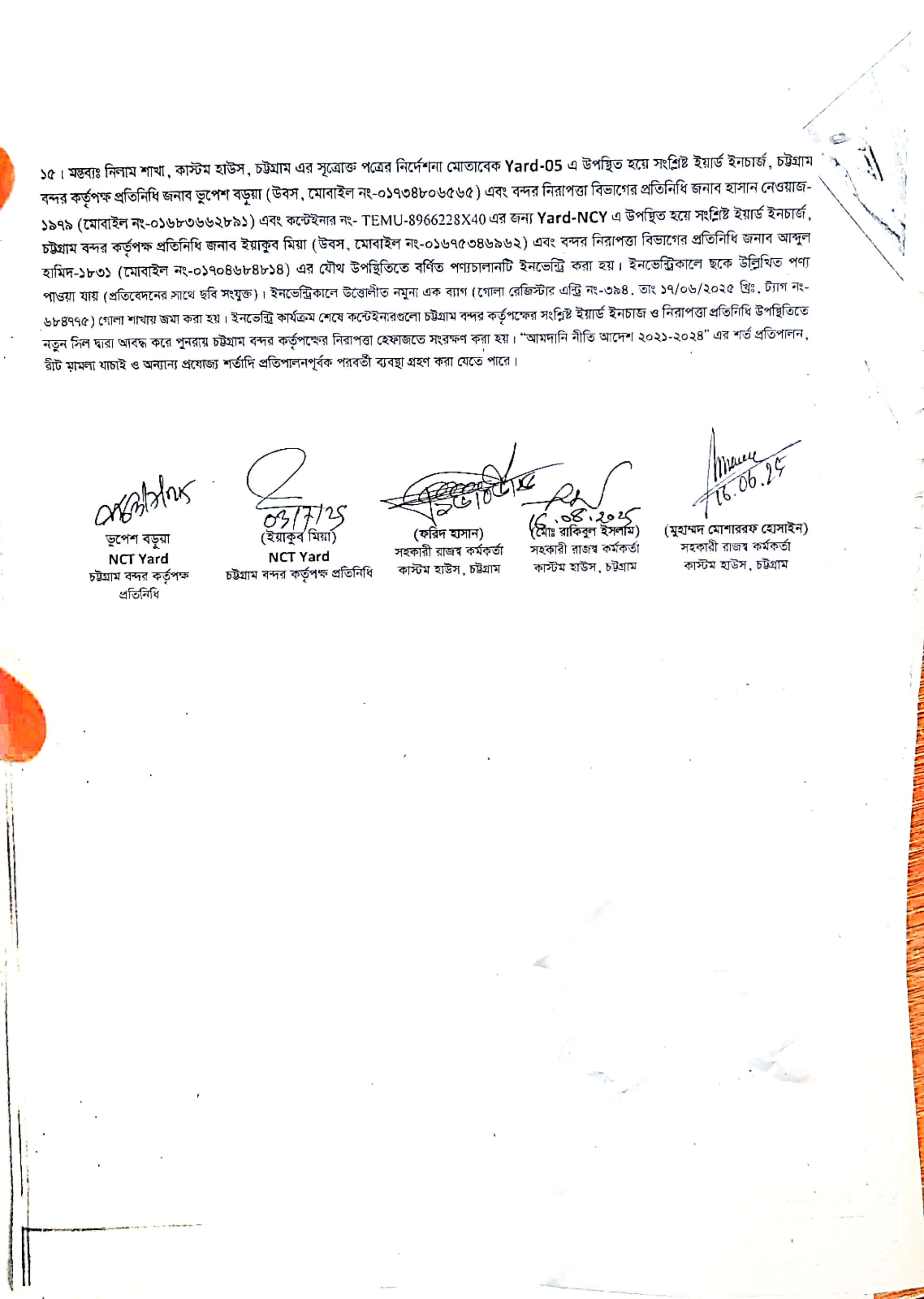 Terms & condition : আমদানি নীতি আদেশ এবং বিদ্যমান অন্যান্য আইন ও বিধি-বিধানের প্রযোজ্য সকল শর্ত পরিপালন এবং প্রযোজ্য ক্ষেত্রে রাসায়নিক পরীক্ষায় পণ্যের সঠিকতা ও ব্যবহার উপযোগিতা থাকা সাপেক্ষে পণ্য ছাড়যোগ্য হবে। যে সকল লটভুক্ত পণ্যচালানে মেয়াদ উত্তীর্ণ/ধ্বসংযোগ্য পণ্য অন্তর্ভুক্ত রয়েছে, সে সকল পণ্যচালানের ক্ষেত্রে মেয়াদ উত্তীর্ণ/ধ্বসংযোগ্য পণ্য ব্যতীত (প্রযোজ্য ক্ষেত্রে) কেবল মেয়াদযুক্ত/নিলামযোগ্য পণ্যসমূহ বিদ্যমান ও প্রযোজ্য সকল আইন ও বিধি-বিধানের প্রযোজ্য সকল শর্ত পরিপালন সাপেক্ষে পণ্য ছাড়যোগ্য হবে। সার্ভার জটিলতা এড়ানোর জন্য আগ্রহী নিলাম ক্রেতাগণকে সরেজমিন পণ্য দেখে নিলামের নির্ধারিত শেষ তারিখ ও সময়ের (৩০/০৯/২০২৫ খ্রি. তারিখ বিকাল ০৪.০০ টা) পূর্বেই বিশেষ ই-নিলামে অংশগ্রহণ করার জন্য অনুরোধ করা যাচ্ছে। কোনরূপ কারণ দর্শানো ব্যতিরেকে কর্তৃপক্ষ যে কোন সময় ও পর্যায়ে যে কোন লট বা সকল লটের নিলাম আংশিক বা সম্পূর্ণ স্থগিত বা বাতিল করার অধিকার সংরক্ষণ করেন।