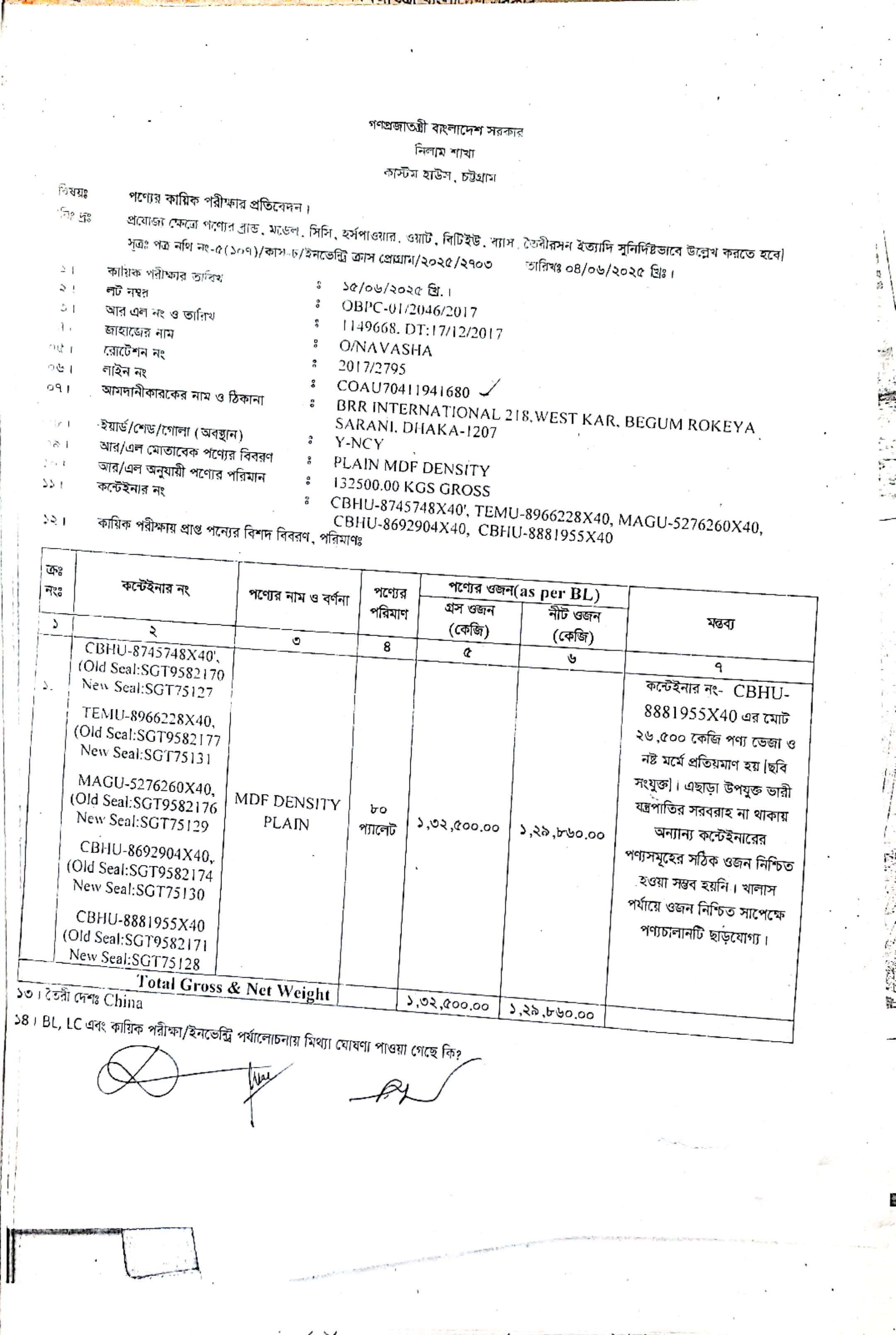 MDF Density Plain (কন্টেইনার নং-CBHU8881955 X 40 এর মোট ২৬,৫০০ কেজি পণ্য ভেজা ও নষ্ট মর্মে প্রতীয়মান) |