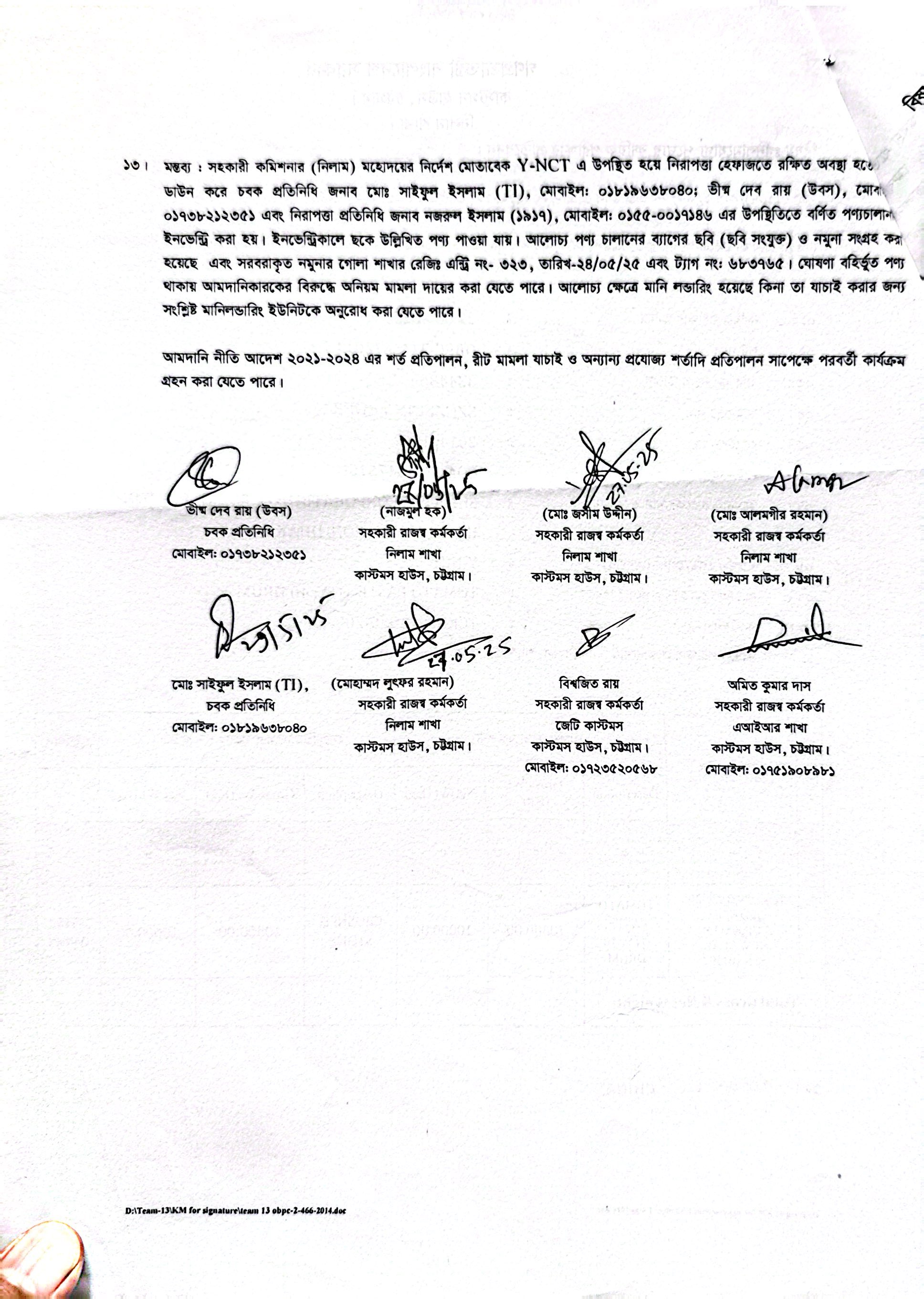 Terms & condition : আমদানি নীতি আদেশ এবং বিদ্যমান অন্যান্য আইন ও বিধি-বিধানের প্রযোজ্য সকল শর্ত পরিপালন এবং প্রযোজ্য ক্ষেত্রে রাসায়নিক পরীক্ষায় পণ্যের সঠিকতা ও ব্যবহার উপযোগিতা থাকা সাপেক্ষে খালাসকালে পণ্যের বর্ণনা এবং ওজন নিশ্চিত করে পণ্য ছাড়যোগ্য হবে। কোন লটভুক্ত পণ্যচালানে মেয়াদ উত্তীর্ণ/ধ্বসংযোগ্য পণ্য অন্তর্ভুক্ত থাকলে, উক্ত পণ্যচালানের ক্ষেত্রে মেয়াদ উত্তীর্ণ/ধ্বসংযোগ্য পণ্য ব্যতীত (প্রযোজ্য ক্ষেত্রে) কেবল মেয়াদযুক্ত/নিলামযোগ্য পণ্যসমূহ বিদ্যমান ও প্রযোজ্য আইন ও বিধি-বিধানের প্রযোজ্য সকল শর্ত পরিপালন সাপেক্ষে পণ্য ছাড়যোগ্য হবে। সার্ভার জটিলতা এড়ানোর জন্য আগ্রহী নিলাম ক্রেতাগণকে সরেজমিন পণ্য দেখে নিলামের নির্ধারিত শেষ তারিখ ও সময়ের (২৭/১১/২০২৫ খ্রি. তারিখ বিকাল ০৪.০০ টা) পূর্বেই বিশেষ ই-নিলামে অংশগ্রহণ করার জন্য অনুরোধ করা যাচ্ছে। কোনরূপ কারণ দর্শানো ব্যতিরেকে কর্তৃপক্ষ যে কোন সময় ও পর্যায়ে যে কোন লট বা সকল লটের নিলাম আংশিক বা সম্পূর্ণ স্থগিত বা বাতিলের অধিকার সংরক্ষণ করেন।