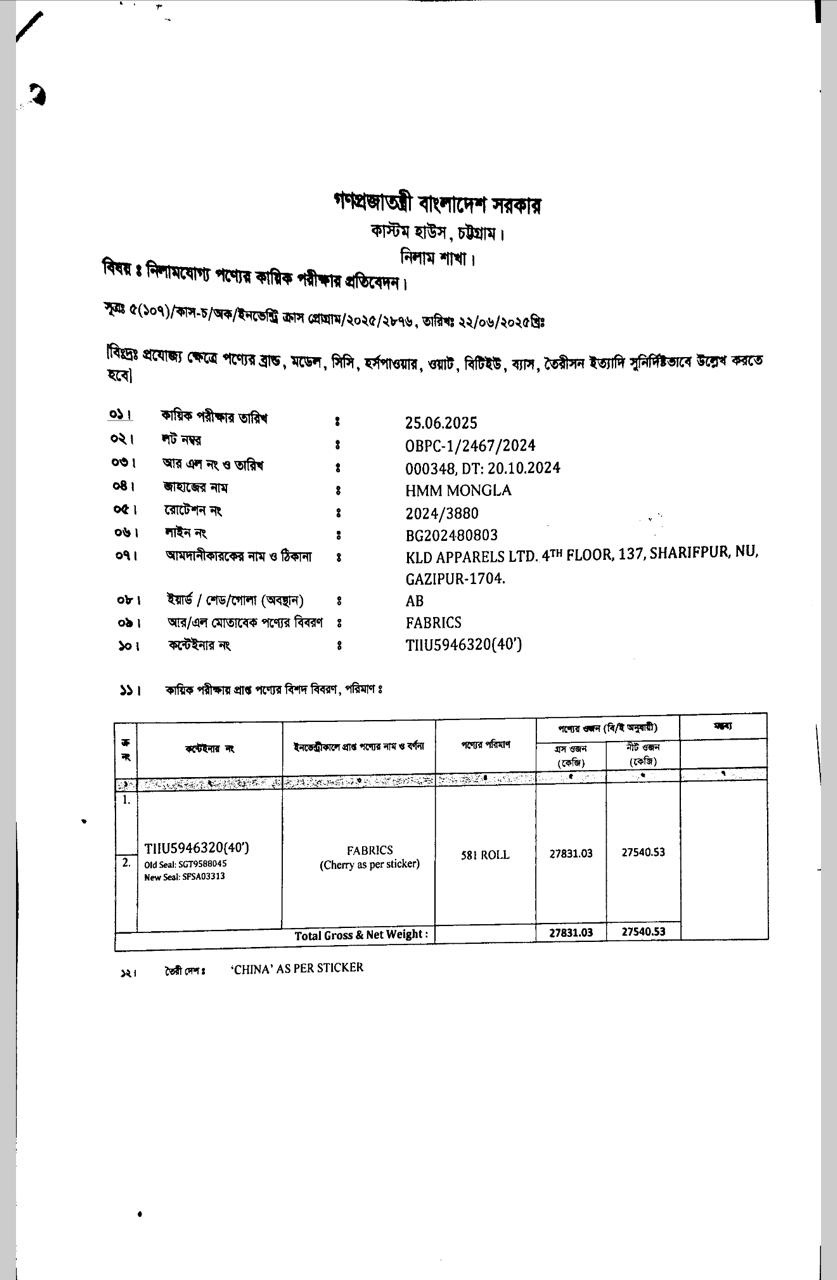 লট নং OBPC-১/২৪৬৭/২৪/২০২৫/৩০১