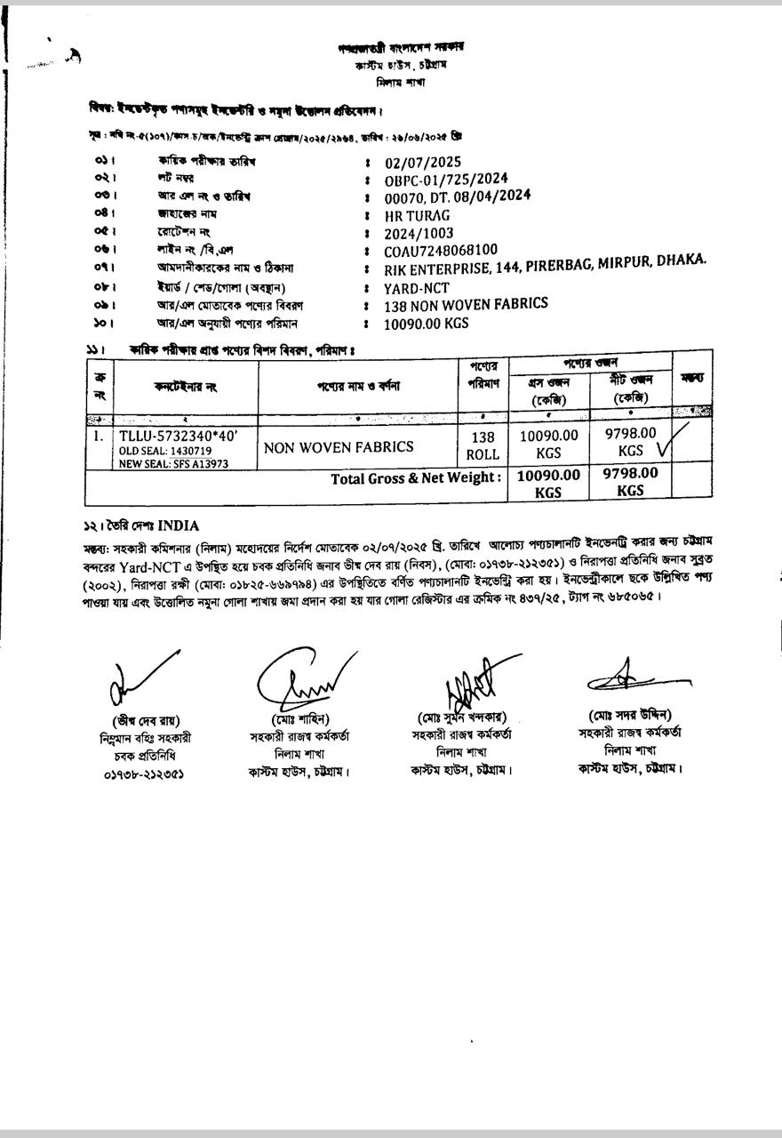 Terms & condition : আমদানি নীতি আদেশ এবং বিদ্যমান অন্যান্য আইন ও বিধি-বিধানের প্রযোজ্য সকল শর্ত পরিপালন সাপেক্ষে পণ্য ছাড়যোগ্য হবে। প্রযোজ্য ক্ষেত্রে রাসায়নিক পরীক্ষায় পণ্যের সঠিকতা ও ব্যবহার উপযোগিতা থাকা সাপেক্ষে পণ্য ছাড়যোগ্য হবে। যে সকল লটভুক্ত পণ্যচালানে মেয়াদ উত্তীর্ণ/ধ্বসংযোগ্য পণ্য অন্তর্ভুক্ত রয়েছে, সে সকল পণ্যচালানের ক্ষেত্রে মেয়াদ উত্তীর্ণ/ধ্বসংযোগ্য পণ্য ব্যতীত (প্রযোজ্য ক্ষেত্রে) কেবল মেয়াদযুক্ত/নিলামযোগ্য পণ্যসমূহ বিদ্যমান ও প্রযোজ্য সকল আইন ও বিধি-বিধানের প্রযোজ্য সকল শর্ত পরিপালন সাপেক্ষে পণ্য ছাড়যোগ্য হবে। কোনরূপ কারণ দর্শানো ব্যতিরেকে কর্তৃপক্ষ যে কোন সময় ও পর্যায়ে যে কোন লট বা সকল লটের নিলাম আংশিক বা সম্পূর্ণ স্থগিত বা বাতিল করার অধিকার সংরক্ষণ করেন।